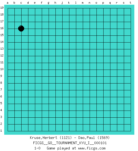 Last move : 1-0 2022 October 25 6:25:31 [Event "FICGS__GO__TOURNAMENT_KYU_I__000101"] [Site "FICGS"] [Date "2022.09.25"] [Round "1"] [Black "Kruse,Herbert"] [White "Dao,Paul"] [Result "1-0"] [Rating 1 "1121"] [Rating 2 "1569"] 1.c16 1-0 This go game has been lost on time (started : 2022.09.25 1:43:6) Follow this game move after move (download)Don't disturb symmetry. (Anonymous) Unless I accept my faults I will most certainly doubt my virtues. (Hugh Prather)