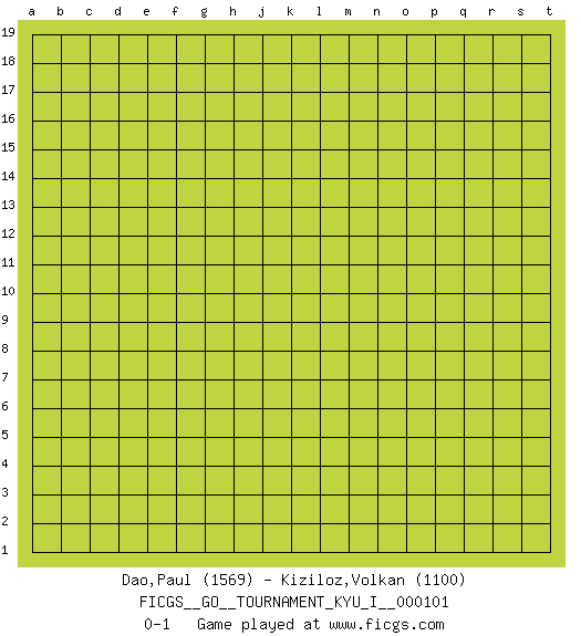 Last move : 0-1 2022 October 25 6:25:31 [Event "FICGS__GO__TOURNAMENT_KYU_I__000101"] [Site "FICGS"] [Date "2022.09.25"] [Round "1"] [Black "Dao,Paul"] [White "Kiziloz,Volkan"] [Result "0-1"] [Rating 1 "1569"] [Rating 2 "1100"] 0-1 This go game has been lost on time (started : 2022.09.25 1:43:6) Follow this game move after move (download)Every move brings change. (Pierre Audouard) Now the reason the enlightened prince and the wise general conquer the enemy whenever they move and their achievements surpass those of ordinary men is foreknowledge. (Sun Tzu)