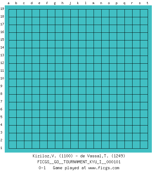 Last move : 0-1 2022 October 25 6:25:31 [Event "FICGS__GO__TOURNAMENT_KYU_I__000101"] [Site "FICGS"] [Date "2022.09.25"] [Round "1"] [Black "Kiziloz,Volkan"] [White "de Vassal,Thibault"] [Result "0-1"] [Rating 1 "1100"] [Rating 2 "1249"] 0-1 This go game has been lost on time (started : 2022.09.25 1:43:6) Follow this game move after move (download)In opponents' sphere of influence, avoid sharp conflict, don't move too deep. (Otake Hideo, 9p) I don't diet. I just don't eat as much as I'd like to. (Linda Evangelista, supermodel)