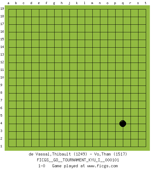 Last move : 1-0 2022 October 25 6:25:31 [Event "FICGS__GO__TOURNAMENT_KYU_I__000101"] [Site "FICGS"] [Date "2022.09.25"] [Round "1"] [Black "de Vassal,Thibault"] [White "Vo,Tham"] [Result "1-0"] [Rating 1 "1249"] [Rating 2 "1517"] 1.q4 1-0 This go game has been lost on time (started : 2022.09.25 1:43:6) Follow this game move after move (download)The weak player fears ko, the strong player seeks it. (Bill Taylor) As a goal marker shodan is important. As a destination it is a poor place to stop. (Thomas Tamayo)