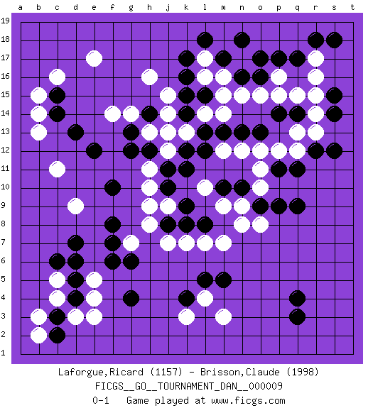 Last move : 0-1 2007 September 8 8:26:48 [Event "FICGS__GO__TOURNAMENT_DAN__000009"] [Site "FICGS"] [Date "2007.08.11"] [Round "1"] [Black "Laforgue,Ricard"] [White "Brisson,Claude"] [Result "0-1"] [Rating 1 "1157"] [Rating 2 "1998"] 1.q4 d3 2.q17 c16 3.q11 e17 4.k16 d9 5.g4 e5 6.k4 q15 7.o16 r17 8.r18 r16 9.s18 o15 10.n16 p16 11.p17 n15 12.k11 m16 13.m17 n17 14.o17 l17 15.n18 l16 16.k15 m15 17.k17 o11 18.q9 q12 19.r12 q13 20.p11 o12 21.q3 h16 22.d13 c11 23.g13 h13 24.h14 g14 25.g12 f14 26.e12 j14 27.h12 j13 28.l18 j12 29.j11 h11 30.f10 h10 31.f8 h8 32.k9 j7 33.g6 l7 34.n10 o10 35.o9 n9 36.m10 o8 37.p9 n8 38.l8 m7 39.j8 j9 40.k8 g7 41.f7 k7 42.j10 h9 43.l13 l14 44.k14 k13 45.k12 j15 46.m13 m12 47.n13 n12 48.o13 p12 49.p14 p15 50.q14 r14 51.l12 r13 52.s12 m9 53.s15 r15 54.l15 m14 55.s14 l10 56.c6 c5 57.d7 b13 58.c14 b14 59.c15 b15 60.c3 c4 61.d4 e3 62.d5 e4 63.d6 b3 64.c2 b2 65.f6 m3 66.m5 l4 67.l5 k3 0-1 Comment by player 1 : Ricard Laforgue : Thank you for the game. Here are the names of the openings (joseki) played in the four corners : Player White won this Go (weiqi, baduk) game. Follow this game move after move (download)When your opponent is thick, you must also become thick. (Otake Hideo, 9p) The Movers & Shakers of this world are those who play chess in the mornings and go to the disco in the evenings. (Dinesh De Silva)