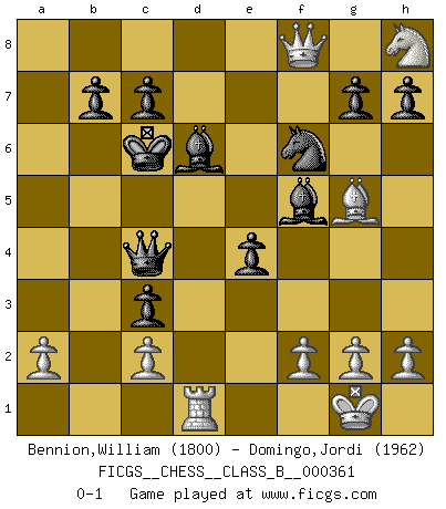 Last move : 0-1 2023 April 30 13:54:38 [Event "FICGS__CHESS__CLASS_B__000361"] [Site "FICGS"] [Date "2022.09.26"] [Round "1"] [White "Bennion,William"] [Black "Domingo,Jordi"] [Result "0-1"] [WhiteElo "1800"] [BlackElo "1962"] 1.e4 e5 2.Nf3 f5 3.Nxe5 Nf6 4.Bc4 Qe7 5.d4 Nc6 6.Nf7 d5 7.Nxh8 dxc4 8.O-O fxe4 9.d5 Nb4 10.Bg5 Nbxd5 11.Re1 Bf5 12.Qd4 Qe6 13.Nd2 O-O-O 14.Qxa7 Nb6 15.b3 c3 16.Nc4 Nxc4 17.bxc4 Qxc4 18.Rad1 Rxd1 19.Qa8+ Kd7 20.Rxd1+ Bd6 21.Qf8 Kc6 0-1 This chess game has been lost on time (started : 2022.09.26 13:24:24) Follow this game move after move (download)Bobby is the most misunderstood, misquoted celebrity walking the face of this earth. (Yasser Seirawan) Fischer: 'Remis!?' Uhlmann: 'Aber es muss doch dreimal Zugwiederholung sein!' Fischer: 'Sie nehmen das Remis an, wie ich es sage, sonst spiele ich weiter und werde Sie dann schlagen!' (Robert James Fischer) Debió haber existido una vez en que los hombres eran semidióses, de otra manera no hubiesen podido inventar el Ajedrez. (Gustav Schenk) La vie et les Echecs sont tous les deux une lutte constante. (Lasker) The Internet is so big, so powerful and pointless that for some people it is a complete substitute for life. (Andrew Brown)