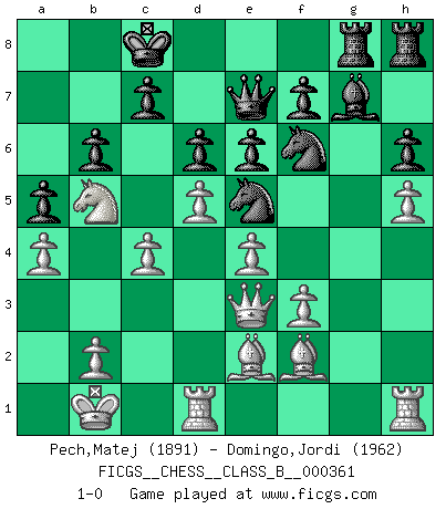 Last move : 1-0 2023 July 23 2:0:38 [Event "FICGS__CHESS__CLASS_B__000361"] [Site "FICGS"] [Date "2022.09.26"] [Round "1"] [White "Pech,Matej"] [Black "Domingo,Jordi"] [Result "1-0"] [WhiteElo "1891"] [BlackElo "1962"] 1.c4 g5 2.d4 h6 3.e4 Bg7 4.Nc3 d6 5.Be3 Nf6 6.f3 Nc6 7.Qd2 e6 8.O-O-O Qe7 9.h4 g4 10.h5 gxf3 11.gxf3 Bd7 12.Nb5 Qd8 13.Kb1 a6 14.Nc3 Qe7 15.Nge2 O-O-O 16.Bf2 Nh7 17.d5 Ne5 18.Qe3 b6 19.Nd4 Rdg8 20.Be2 Nf6 21.a4 a5 22.Ncb5 Bxb5 23.Nxb5 1-0 This chess game has been lost on time (started : 2022.09.26 13:24:24) Follow this game move after move (download)Later, I began to succeed in decisive games. Perhaps because I realized a very simple truth: not only was I worried, but also my opponent. (Mikhail Tal) Über die Verhaftung Bobby Fischers: Warum es die Bush-Administration für nötig befindet einen 61 Jahre alten Mann zu hetzten, der für niemanden ausser sich selbste eine Gefahr darstellt ist ein Rätsel. (Nigel Short) Cuando tengo las piezas blancas, yo gano porque soy blanco; Cuando tengo las piezas negras, yo gano porque soy Bogolyubov. (Bogolyubov) Botvinnik disait en comparant les échecs à la musique: Il existe une science dont le but est l'étude de l'acoustique et des sons. Mais il y a aussi un art qui se sert de l'océan des sons : c'est la musique. De toute évidence, il en est de même pour la pensée. La logique est l'étude des lois de la réflexion et les échecs reflètent, en tant qu'art, le côté logique de la réflexion, sous la forme d'images artistiques... Extrait de Fischer - Spassky, Reykjavik 1972 par Alexander & F. Wyndham (Ed. Solar), p 37. Unless in communicating with it one says exactly what one means, trouble is bound to result. (Alan Turing, about computers)