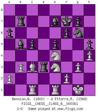 Last move : 1-0 2023 April 17 2:23:30 [Event "FICGS__CHESS__CLASS_B__000361"] [Site "FICGS"] [Date "2022.09.26"] [Round "1"] [White "Bennion,William"] [Black "d Ettorre,Rodolfo"] [Result "1-0"] [WhiteElo "1800"] [BlackElo "1968"] 1.e4 c5 2.Na3 Nc6 3.Bb5 a6 4.Bxc6 bxc6 5.Nf3 d5 6.O-O e6 7.d3 Ne7 8.h4 h5 9.c4 Ng6 10.exd5 cxd5 11.Re1 f6 12.cxd5 Qxd5 13.Nc4 Rb8 14.Qc2 Kf7 15.Bd2 e5 16.Rac1 Bg4 17.Nh2 Be6 18.Re4 Be7 19.b3 Qd7 20.g3 Bd5 21.Nf1 Ba8 22.Kh2 Rhd8 23.Ba5 Qxd3 24.Qxd3 Rxd3 25.R4e1 Bc6 26.Kg1 Bb5 27.Nfe3 Rb7 28.Nd2 Bc6 29.Bc3 Bb5 30.Ne4 1-0 Follow this game move after move (download)I had a toothache during the first game. In the second game I had a headache. In the third game it was an attack of rheumatism. In the fourth game, I wasn't feeling well. And in the fifth game? Well, must one have to win every game ? (Siegbert Tarrasch) Ich könnte leicht behaupten: Ja,ja, Leonid Breschnew wollte nicht, daß ich Weltmeister werde. In der Tat war die Sache komplizierter. (Viktor Kortschnoi) ¿Porque tengo que perder ante este idiota?. (Aron Nimzovich) Horreur, mais aussi harmonie suprême : qu'y avait-il en effet au monde en dehors des échecs ? Le brouillard, l'inconnu, le non-être... (Vladimir Nabokov) The arrogant army will lose certainly the battle. (Chinese proverb)