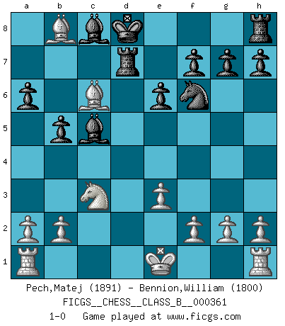 Last move : 1-0 2023 February 14 20:8:57 [Event "FICGS__CHESS__CLASS_B__000361"] [Site "FICGS"] [Date "2022.09.26"] [Round "1"] [White "Pech,Matej"] [Black "Bennion,William"] [Result "1-0"] [WhiteElo "1891"] [BlackElo "1800"] 1.d4 d5 2.c4 e6 3.Nc3 Be7 4.Bf4 Nf6 5.Nf3 dxc4 6.e3 a6 7.Bxc4 b5 8.Be2 Nbd7 9.Ne5 Nxe5 10.Bxe5 c5 11.Bf3 Ra7 12.dxc5 Bxc5 13.Qxd8+ Kxd8 14.Bb8 Rd7 15.Bc6 1-0 Follow this game move after move (download)What is the difference between chess and football? Everybody understands football, but nobody plays it. Everybody plays chess, but nobody understands it. Everything is relative. (Vladimir Kramnik) Wenn Capablanka heute auf der Schachbühne erscheinen würde, hätte er ein halbes Jahr gebraucht um sich die Schachtheorie anzueignen. Und dann hätte er alles und jeden besiegt. (Mikhail Moiseyevich Botvinik) Yo he agregado estos principios a la ley: pongan los Caballos en acción antes de que los dos Alfiles sean desarrollados. (Emanuel Lasker) Aidez vos pièces, elles vous aideront. (Paul Morphy) It is a good thing for an uneducated man to read books of quotations. (Winston Churchill)