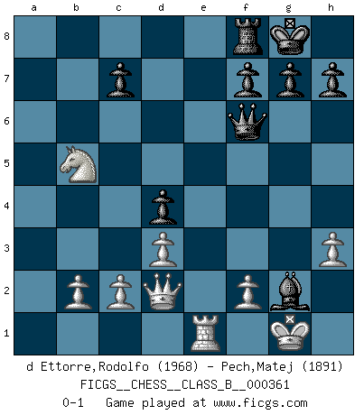 Last move : 0-1 2023 March 8 9:15:31 [Event "FICGS__CHESS__CLASS_B__000361"] [Site "FICGS"] [Date "2022.09.26"] [Round "1"] [White "d Ettorre,Rodolfo"] [Black "Pech,Matej"] [Result "0-1"] [WhiteElo "1968"] [BlackElo "1891"] 1.e4 e5 2.Nf3 Nc6 3.Bb5 a6 4.Ba4 Nf6 5.O-O Be7 6.Re1 b5 7.Bb3 O-O 8.h3 Bb7 9.d3 d5 10.exd5 Nxd5 11.a4 Nd4 12.Nxd4 exd4 13.axb5 axb5 14.Rxa8 Bxa8 15.Na3 Bb4 16.Bd2 Bxd2 17.Qxd2 Qf6 18.Bxd5 Bxd5 19.Nxb5 Bxg2 0-1 This chess game has been lost on time (started : 2022.09.26 13:24:24) Follow this game move after move (download)In blitz, the Knight is stronger than the Bishop. (Vlastimil Hort) Darum geht es im Schach. Einen Tag gibst du deinem Gegner eine Lektion, am nächsten Tag gibt er dir eine. (Robert James Fischer) En el tablero, la mentira e hipocresía no sobreviven mucho. (Emanuel Lasker) Il s'avisa de me proposer d'apprendre les échecs qu'il jouait un peu... me voilà forcené des échecs. J'achète un échiquier, je m'enferme dans ma chambre, j'y passe des jours et des nuits à vouloir apprendre par cur toutes les parties. (Jean-Jacques Rousseau, Confessions) Follow your passion, and success will follow you. (Arthur Buddhold)