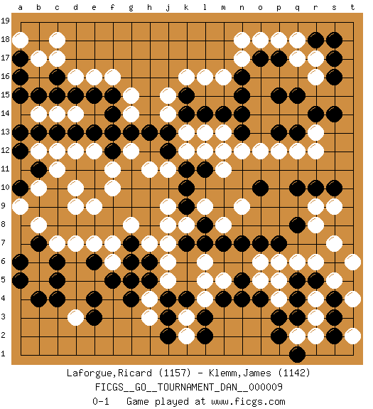 Last move : 0-1 2008 January 18 11:27:13 [Event "FICGS__GO__TOURNAMENT_DAN__000009"] [Site "FICGS"] [Date "2007.08.11"] [Round "1"] [Black "Laforgue,Ricard"] [White "Klemm,James"] [Result "0-1"] [Rating 1 "1157"] [Rating 2 "1142"] 1.q4 r16 2.c4 d16 3.j4 d7 4.e4 d10 5.p17 n17 6.s17 r17 7.p15 l16 8.r14 p18 9.q10 q12 10.p13 p12 11.o10 o12 12.n14 r13 13.q13 r12 14.s14 m13 15.m14 m11 16.l14 j15 17.o17 o18 18.n16 n18 19.s16 d3 20.e3 q2 21.q3 r3 22.p2 r4 23.q5 r6 24.r5 s5 25.s6 s7 26.s4 t6 27.s3 q6 28.s10 p5 29.o4 r2 30.s2 o5 31.n4 n9 32.o7 o6 33.n7 m5 34.p7 p6 35.m4 l6 36.l8 l4 37.l3 k3 38.k4 l5 39.l2 k13 40.k14 j14 41.j13 l13 42.j12 j11 43.k11 k12 44.k10 h11 45.h13 g14 46.n13 n12 47.m12 l12 48.l11 m12 49.g13 f11 50.e13 m8 51.m7 l9 52.k9 k8 53.l7 j8 54.k7 j9 55.f14 g15 56.d11 c11 57.e11 c12 58.e10 d9 59.f12 f10 60.e15 e16 61.d15 e9 62.d13 d12 63.c16 c17 64.c15 b17 65.b13 r9 66.r10 s9 67.n5 e12 68.c6 g12 69.f13 b14 70.b15 h4 71.j3 h3 72.h6 j5 73.h5 g5 74.g6 f6 75.f5 c7 76.e6 f7 77.g4 m16 78.n15 c14 79.c13 d14 80.f15 f16 81.a15 b6 82.c5 b5 83.b4 b12 84.a13 e7 85.r18 q18 86.s18 q17 87.q15 h7 88.g7 g8 89.a17 a18 90.a16 c18 91.a5 j6 92.g5 j7 93.a12 a11 94.q8 r8 95.k15 k16 96.b7 b8 97.a6 t4 98.q1 p4 99.p3 k2 100.j2 t2 101.a10 a9 102.b11 b10 0-1 Here are the names of the openings (joseki) played in the four corners : Corner q16 : r16 p17 Komoku (Somok, Xiao~mu`) 3-4 Point. The komoku (3-4) point is the traditional corner enclosure move.. Ikken Kakari (Hankan Keolch'im, Yi Gua`jiao~, 1-Space Low Pincer). The small knight move is the basic approach move to the 3-4 point stone. It has been continually used for over four centuries. There are limitless variations, with new moves constantly being discovered. Black 2 opens the door to a treaure store of joseki. Corner q4 : q4 q2 Hoshi (Hwajeom, Seongjeom, Xingwei`) 4-4 Point. The star or hoshi (4-4) point, emphasizing influence at the potential expense of territory. Player White won this Go (weiqi, baduk) game. Follow this game move after move (download)The second line is the line of defeat, the third line is the line of territory, and the fourth line is the line of influence. (Anonymous) History is a gallery of pictures in which there are few originals and many copies. (Alexis de Tocqueville)