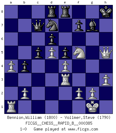 Last move : 1-0 2023 January 2 12:16:9 [Event "FICGS__CHESS__RAPID_B__000385"] [Site "FICGS"] [Date "2022.10.01"] [Round "1"] [White "Bennion,William"] [Black "Vollmer,Steve"] [Result "1-0"] [WhiteElo "1800"] [BlackElo "1790"] 1.e4 c5 2.Na3 e5 3.Nf3 d6 4.Bc4 Be7 5.O-O Nf6 6.d3 O-O 7.Bb3 Nc6 8.h3 a6 9.Nc4 b5 10.Ne3 Bb7 11.a3 Qc7 12.Re1 Rad8 13.a4 b4 14.Bd2 a5 15.c3 h6 16.Nh4 Kh8 17.Nhf5 Bc8 18.Bc4 Be6 19.Qf3 Bxc4 20.dxc4 Rfe8 21.Nd5 Nxd5 22.cxd5 Nb8 23.cxb4 axb4 24.Bxh6 Bf6 25.Re3 Nd7 26.Bxg7+ Bxg7 27.Qh5+ 1-0 Follow this game move after move (download)We cannot resist the fascination of sacrifice, since a passion for sacrifices is part of a Chessplayer's nature. (Rudolf Spielman) Ich tröste mich mit dem Vergnügen, daß Schachfans, Zuschauer und Leser glücklich sind, wenn ein Großmeister etwas riskiert, statt nur Klötzchen zu schieben. (Mikhail Nekhemyevich Tal) Muchos se han convertido en Maestros de Ajedrez, nadie se ha convertido en el Maestro del Ajedrez. (Siegbert Tarrasch) Assurément je connaissais par expérience le mystérieux attrait de ce jeu royal, le seul entre tous les jeux inventés par les hommes qui échappe souverainement à la tyrannie du hasard, le seul où l'on ne doive sa victoire qu'à son intelligence ou plutôt à une certaine forme d'intelligence. Mais n'est-ce pas déjà le limiter injurieusement que d'appeler les échecs un jeu ? N'est-ce pas une science, un art ou quelque chose qui, comme le cercueil de Mahomet entre ciel et terre, est suspendu entre l'un et l'autre, et qui réunit un nombre incroyable de contraires ? [...] C'est une pensée qui ne mène à rien, une mathématique qui n'établit rien, un art qui ne laisse pas d'uvre, une architecture sans matière; et il l'a prouvé néanmoins qu'il était plus durable, à sa manière, que les livres ou que tout autre monument, ce jeu unique qui appartient à tous les peuples et à tous les temps, et dont personne ne sait quel dieu en fit don à la terre pour tuer l'ennui, pour aiguiser l'esprit et stimuler l'âme. Où commence-t-il, où finit-il ? (Stefan Zweig) Creativity is allowing yourself to make mistakes. Art is knowing which ones to keep. (Scott Adams)