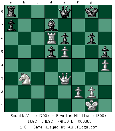 Last move : 1-0 2022 December 28 10:53:51 [Event "FICGS__CHESS__RAPID_B__000385"] [Site "FICGS"] [Date "2022.10.01"] [Round "1"] [White "Roubik,Vit"] [Black "Bennion,William"] [Result "1-0"] [WhiteElo "1700"] [BlackElo "1800"] 1.e4 c5 2.c3 g6 3.d4 cxd4 4.cxd4 d5 5.e5 Nh6 6.Nc3 Bg7 7.Bf4 Nc6 8.Qd2 Nf5 9.Nf3 h5 10.Bb5 f6 11.h4 O-O 12.O-O fxe5 13.dxe5 e6 14.Bxc6 bxc6 15.Bg5 Qa5 16.a3 Ba6 17.b4 Qc7 18.Rfe1 c5 19.Rac1 c4 20.b5 Bb7 21.Ne2 Rac8 22.Ned4 c3 23.Qc2 Qf7 24.Re3 Nxe3 25.Bxe3 Rc4 26.a4 Bc8 27.Qd3 Rxa4 28.Rxc3 Rd8 29.Rc6 Bd7 30.Rd6 Qe8 31.Bg5 Rxd4 32.Qxd4 Ra8 33.Qe3 Bxb5 34.Bh6 Bxh6 35.Qxh6 Qf7 36.Qe3 Qe8 37.Nd4 Bd7 38.Nb3 1-0 Follow this game move after move (download)It is the aim of the modern school, not to treat every position according to one general law, but according to the principle inherent in the position. (Richard Reti) Das Spiel gibt uns die Genugtuung, die das Leben uns versagt. (Emanuel Lasker) Ciertamente, de todas la drogas del mundo, el Ajedrez debe ser el mas placentero permamentemente. (Assiac) Psychologiquement, tu dois avoir confiance en toi même, mais cette confiance doit être basée sur des faits. (Robert Fischer) Over-the-board chess is the favorite of mortals, correspondence chess is the favorite of the gods. (Eduard Dyckhoff)