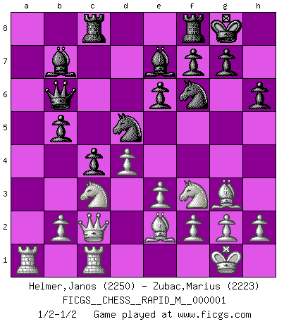 Last move : 1/2-1/2 2006 June 12 23:25:28 [Event "FICGS__CHESS__RAPID_M__000001"] [Site "FICGS"] [Date "2006.04.10"] [Round "1"] [White "Helmer,Janos"] [Black "Zubac,Marius"] [Result "1/2-1/2"] [WhiteElo "2250"] [BlackElo "2223"] 1.Nf3 d5 2.c4 e6 3.d4 c6 4.Qc2 dxc4 5.Qxc4 Nf6 6.Bg5 Be7 7.Nc3 b5 8.Qb3 Nbd7 9.e3 a6 10.Be2 O-O 11.O-O c5 12.Rfd1 c4 13.Qc2 Bb7 14.a4 Qb6 15.Nd2 Rac8 16.axb5 axb5 17.Rdc1 h6 18.Bf4 Nd5 19.Bg3 N7f6 20.Nf3 1/2-1/2 Reti Opening Kingside Castling by player Black (move 10) Kingside Castling by player White (move 11) This chess game ended in a draw. Follow this game move after move (download)Avoid the crowd. Do your own thinking independently. Be the Chess player, not the Chess piece. (Ralph Charell) Ein guter Spieler hat immer Glück. (José Raúl Capablanca) Tu sabes, camarada Pachman, no disfruto el ser un Ministro, preferería jugar al Ajedrez como tu. (Che Guevara) Des points faibles ou des trous dans la position de l'adversaire doivent être occupés par des pièces et non pas par des pions. (Siegbert Tarrasch) Life is like a ten-speed bicycle: most of us have gears we never use. (Charles M. Schulz)
