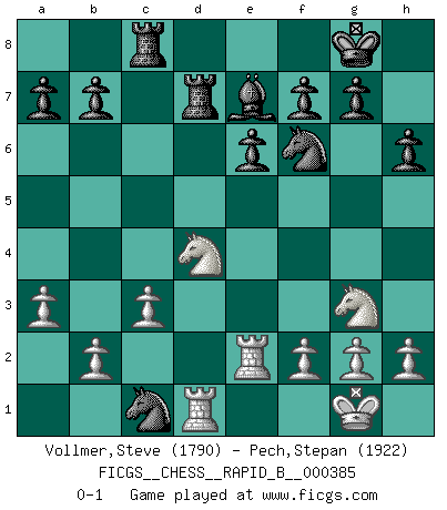 Last move : 0-1 2023 January 22 20:38:49 [Event "FICGS__CHESS__RAPID_B__000385"] [Site "FICGS"] [Date "2022.10.01"] [Round "1"] [White "Vollmer,Steve"] [Black "Pech,Stepan"] [Result "0-1"] [WhiteElo "1790"] [BlackElo "1922"] 1.e4 c6 2.d4 d5 3.Nc3 dxe4 4.Nxe4 Bf5 5.Ng3 Bg6 6.Nf3 Nd7 7.Bd3 Bxd3 8.Qxd3 e6 9.O-O Ngf6 10.Bd2 Be7 11.Rad1 O-O 12.Bc1 c5 13.c3 cxd4 14.Qxd4 Qa5 15.a3 Qb5 16.Qd3 Qxd3 17.Rxd3 Nc5 18.R3d1 h6 19.Rfe1 Rfd8 20.Nd4 Rd7 21.Re2 Nb3 22.Rc2 Rc8 23.Re2 Nxc1 0-1 Follow this game move after move (download)The isolated Pawn casts gloom over the entire chessboard. (Aaron Nimzovich) Ich kämpfe solange mein Gegner einen Fehler machen kann. (Emanuel Lasker) El Ajedrez es el gimnasio de la mente. (Blaise Pascal) C'est une question de caractère, Beaucoup de gens perdent leur motivation très vite. D'autres, ils sont rares, peuvent la conserver très longtemps. J'aime les échecs, encore aujourd'hui je suis heureux d'analyser des parties. J'aime toujours gagner, je déteste encore perdre. Bien jouer est important pour mon intégrité intellectuelle et morale. Et puis les échecs vivent en ce moment une période historique grâce à Internet. Ils se développent dans les systèmes éducatifs à travers le monde. Ils sortent de leur ghetto, et c'est mon rôle de mener à bien cette révolution. (Gary Kasparov) Lamb in skin of tiger, still fears the wolf. (Chinese proverb)