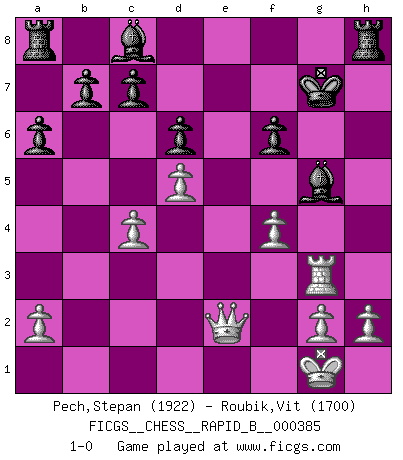 Last move : 1-0 2022 December 28 21:26:27 [Event "FICGS__CHESS__RAPID_B__000385"] [Site "FICGS"] [Date "2022.10.01"] [Round "1"] [White "Pech,Stepan"] [Black "Roubik,Vit"] [Result "1-0"] [WhiteElo "1922"] [BlackElo "1700"] 1.e4 e5 2.Nf3 Qf6 3.Nc3 Nc6 4.d4 Bb4 5.Bd2 exd4 6.Nd5 Qd6 7.c3 dxc3 8.bxc3 Ba5 9.Bf4 Qc5 10.Bd3 Nge7 11.O-O d6 12.Rb1 a6 13.Be3 Qa3 14.Bc2 Nxd5 15.exd5 Ne5 16.Rb3 Nxf3+ 17.Qxf3 Qa4 18.Bd4 O-O 19.Re1 Qd7 20.Bxh7+ Kxh7 21.Qh5+ Kg8 22.Bxg7 Kxg7 23.Qg5+ Kh8 24.Re4 f6 25.Rh4+ Qh7 26.Rxh7+ Kxh7 27.Qh5+ Kg7 28.c4 Bd2 29.Rg3+ Bg5 30.f4 Rh8 31.Qe2 1-0 Follow this game move after move (download)Chess demands total concentration. (Bobby Fischer) Im Schach gewinnt jeder. Hat man Freunde am Spiel - und das ist die Hauptsache - ist auch der Verlust einer Partie kein Unglück. (David Bronstein) El Ajedrez demanda una total concentración. (Bobby Fischer) Les échecs, c'est la lutte contre l'erreur. (Johannes Zukertort) The Movers & Shakers of this world are those who play chess in the mornings and go to the disco in the evenings. (Dinesh De Silva)