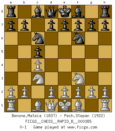 Last move : 0-1 2022 November 28 12:11:58 [Event "FICGS__CHESS__RAPID_B__000385"] [Site "FICGS"] [Date "2022.10.01"] [Round "1"] [White "Benone,Mateia"] [Black "Pech,Stepan"] [Result "0-1"] [WhiteElo "1837"] [BlackElo "1922"] 1.Nf3 Nf6 2.c4 c5 3.Nc3 Nc6 0-1 This chess game has been lost on time (started : 2022.10.01 2:23:5) Follow this game move after move (download)Chess is a forcing house where the fruits of character can ripen more fully than in life. (Edward Morgan Foster) Über Kasparov: Es ist offensichtlich, daß er in einem totalitären Staat aufwuchs und deshalb zu diktatorischen Zügen neigt. (Viktor Kortschnoi) ¿Porque tengo que perder ante este idiota?. (Aron Nimzovich) Il n'y a pas de prix trop élevé au scalp de l'ennemi. (Koblentz) I find your interest interesting. (Gregory House, House M.D.)