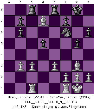 Last move : 1/2-1/2 2022 November 5 4:5:22 [Event "FICGS__CHESS__RAPID_M__000137"] [Site "FICGS"] [Date "2022.10.03"] [Round "1"] [White "Ozen,Bahadir"] [Black "Swiatek,Janusz"] [Result "1/2-1/2"] [WhiteElo "2254"] [BlackElo "2205"] 1.d4 Nf6 2.c4 e6 3.Nf3 d5 4.Nc3 Bb4 5.Bg5 O-O 6.e3 h6 7.Bh4 c5 8.cxd5 exd5 9.dxc5 Nbd7 10.Rc1 Qa5 11.Nd2 g5 12.Bg3 Nxc5 13.Be2 Bxc3 14.bxc3 Re8 15.O-O Bf5 16.Nb3 Nxb3 17.axb3 Rac8 18.Qd4 Qb6 19.Qxb6 axb6 20.Bb5 Bd7 21.Bxd7 1/2-1/2 Follow this game move after move (download)When you play Bobby, it is not a question if you win or lose. It is a question if you survive. (Boris Spassky) Der Vorposten provoziert a) eine Basis für neue Angriffe und b) eine Schwächung der gegnerischen Widerstandskraft in der fraglichen Linie. (Aaron Nimzowitsch) No puedes jugar al Ajedrez si eres de corazón noble. (Proverbio Francés) Un footballeur joue avec ses pieds, parfois avec sa tête. Un joueur d'échecs ne joue qu'avec sa tête. Et quand il ne joue plus, il meurt. (Jacob Murray) What doesn't kill us makes us stronger. (Friedrich Nietzsche)