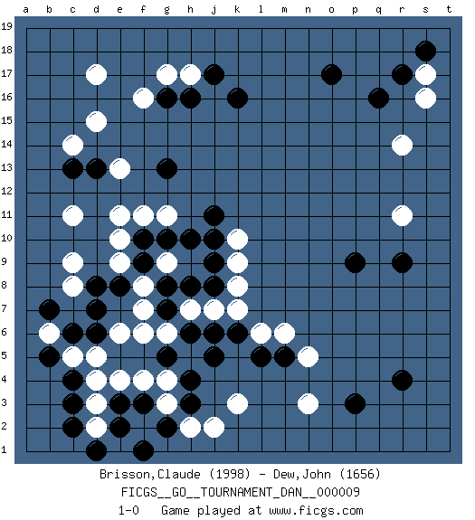 Last move : 1-0 2007 October 10 0:39:30 [Event "FICGS__GO__TOURNAMENT_DAN__000009"] [Site "FICGS"] [Date "2007.08.11"] [Round "1"] [Black "Brisson,Claude"] [White "Dew,John"] [Result "1-0"] [Rating 1 "1998"] [Rating 2 "1656"] 1.q16 d4 2.r4 d17 3.p3 r11 4.r9 r14 5.o17 s16 6.r17 s17 7.s18 c11 8.g16 d15 9.k16 k3 10.c6 c5 11.d6 f4 12.d8 n3 13.p9 h17 14.h16 g17 15.j17 f16 16.c13 c14 17.d13 e11 18.g13 c9 19.g7 c8 20.f10 e10 21.h3 g3 22.h4 g6 23.h6 f6 24.e3 e4 25.g2 f2 26.f3 g4 27.e2 h2 28.f1 j2 29.c3 h7 30.j6 f7 31.g8 f8 32.f9 e9 33.b5 d3 34.c2 d2 35.d1 b6 36.c4 d5 37.b7 k7 38.k6 g9 39.h8 j7 40.j8 k8 41.j9 l6 42.l5 k9 43.j10 m6 44.m5 k10 45.j11 n5 46.e8 f11 47.g10 g11 48.h10 e13 49.g5 h5 50.j5 e6 51.d7 1-0 Here are the names of the openings (joseki) played in the four corners : Corner q16 : q16 r11 Hoshi (Hwajeom, Seongjeom, Xingwei`) 4-4 Point. The star or hoshi (4-4) point, emphasizing influence at the potential expense of territory. Corner d4 : d4 c6 Hoshi (Hwajeom, Seongjeom, Xingwei`) 4-4 Point. The star or hoshi (4-4) point, emphasizing influence at the potential expense of territory. Ikken Kakari (Hankan Keolch'im, Yi Gua`jiao~, 1-Space Low Approach). Black 2 is the standard approach move to the 4-4. Player Black won this Go (weiqi, baduk) game. Follow this game move after move (download)Play slow, win slow; play fast, lose fast. (Anonymous) A good aphorism is too hard for the tooth of time, and is not worn away with the centuries, although it serves as food for every speech. (Friedrich Nietzsche)
