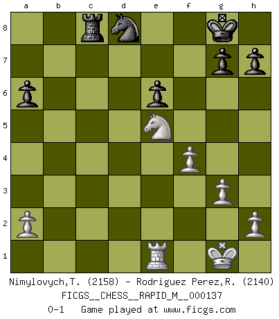 Last move : 0-1 2023 February 17 6:41:55 [Event "FICGS__CHESS__RAPID_M__000137"] [Site "FICGS"] [Date "2022.10.03"] [Round "1"] [White "Nimylovych,Taras"] [Black "Rodriguez Perez,Rene"] [Result "0-1"] [WhiteElo "2158"] [BlackElo "2140"] 1.e4 e6 2.d4 d5 3.Nc3 Nf6 4.e5 Nfd7 5.f4 c5 6.Nf3 Nc6 7.Be3 a6 8.Ne2 Be7 9.c3 O-O 10.dxc5 f6 11.exf6 Nxf6 12.g3 Ne4 13.Ned4 Bxc5 14.Nxc6 bxc6 15.Bxc5 Nxc5 16.Bg2 Qb6 17.b4 Ne4 18.Qd4 Rb8 19.Qxb6 Rxb6 20.Rc1 c5 21.O-O cxb4 22.cxb4 Rxb4 23.Rc7 Rc4 24.Rxc4 dxc4 25.Ne5 Bb7 26.Re1 Nd6 27.Bxb7 Nxb7 28.Nxc4 Rc8 29.Ne5 Nd8 0-1 This chess game has been lost on time (started : 2022.10.03 9:54:11) Follow this game move after move (download)Chess is ruthless: you've got to be prepared to kill people. (Nigel Short) Sitze auf Deine Hände. (Siegbert Tarrasch) La esencia del Ajedrez es pensar acerca de lo que el Ajedrez es. (David Bronstein) Les échecs sont un jeu terrible. Si vous n'avez pas le centre, votre adversaire a une position plus libre. Par contre, si vous avez le centre, alors vous avez vraiment quelque chose pour laquelle vous inquiéter ! (Siegbert Tarrasch) He who fights with monsters should be careful lest he thereby become a monster. (Friedrich Nietzsche, Beyond Good and Evil)