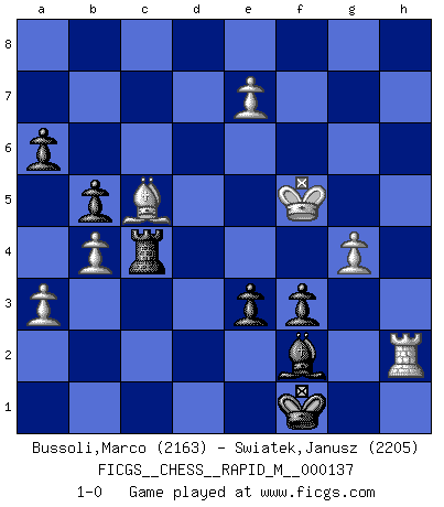 Last move : 1-0 2023 January 10 20:53:28 [Event "FICGS__CHESS__RAPID_M__000137"] [Site "FICGS"] [Date "2022.10.03"] [Round "1"] [White "Bussoli,Marco"] [Black "Swiatek,Janusz"] [Result "1-0"] [WhiteElo "2163"] [BlackElo "2205"] 1.d4 Nf6 2.c4 e6 3.Nf3 d5 4.g3 Bb4+ 5.Bd2 Be7 6.Bg2 O-O 7.Qc2 Nbd7 8.O-O c6 9.Bf4 b6 10.Rd1 Bb7 11.Ne5 Nh5 12.Be3 f5 13.Bd2 Nxe5 14.dxe5 f4 15.e3 g5 16.b4 Rc8 17.Nc3 Qe8 18.a3 Qf7 19.Bc1 Rcd8 20.Rb1 f3 21.Bf1 Ng7 22.Bb2 h5 23.Rd2 a6 24.Na4 b5 25.cxb5 cxb5 26.Nb6 Nf5 27.Rc1 g4 28.Bd3 Bg5 29.Bxf5 Qxf5 30.Qxf5 Rxf5 31.h4 gxh3 32.Bd4 Rf7 33.Rdc2 Rdf8 34.Nc8 Rxc8 35.Rxc8+ Bxc8 36.Rxc8+ Kh7 37.Kh2 Kg6 38.Kxh3 Kf5 39.Rh8 Rg7 40.Rxh5 Ke4 41.g4 Kd3 42.Kg3 Ke2 43.Bb6 Rg8 44.Bd4 Rg7 45.Ba7 Rg8 46.Rh7 Rg6 47.Rh5 Rg7 48.Bd4 Rg8 49.Bc5 Rg6 50.Bf8 Rg8 51.Bc5 Rg6 52.Ba7 Rg8 53.Bb6 Rg6 54.Bc5 Rg7 55.Rh8 Rg6 56.Bf8 Bd8 57.Rh7 Bb6 58.Bc5 Bd8 59.Be7 Bc7 60.Bd6 Bd8 61.Bf8 Rg8 62.Rf7 Rg6 63.Bd6 Rg8 64.Bc7 Bg5 65.Bd6 Bd8 66.Rf6 Rh8 67.Bc5 Rh1 68.e4 dxe4 69.Kf4 Rg1 70.Rxe6 Bh4 71.Rc6 Rc1 72.Rh6 Bxf2 73.Rh2 e3 74.e6 Rc4+ 75.Kf5 Kf1 76.e7 1-0 Follow this game move after move (download)Chess mastery essentially consists of analyzing Chess positions accurately. (Mikhail Botvinnik) Ich habe die besten Aussichten, den ersten Preis zu gewinnen - denn jeder muss gegen Steinitz spielen, nur ich nicht! (Wilhelm Steinitz) Aquel que toma al Peón de Caballo de la Reina, se pasará la noche a dormir en la calle. (Anónimo) J'apprécie les joueurs d'est-indienne, c'est grâce à eux que je nourris ma famille depuis tant d'années. (Petrosian) The ego is not master in its own house. (Sigmund Freud)