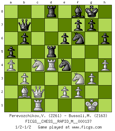 Last move : 1/2-1/2 2022 October 21 12:25:29 [Event "FICGS__CHESS__RAPID_M__000137"] [Site "FICGS"] [Date "2022.10.03"] [Round "1"] [White "Perevozchikov,Vjacheslav"] [Black "Bussoli,Marco"] [Result "1/2-1/2"] [WhiteElo "2261"] [BlackElo "2163"] 1.d4 Nf6 2.c4 e6 3.Nf3 d5 4.g3 Bb4+ 5.Bd2 Be7 6.Bg2 O-O 7.O-O c6 8.b3 b6 9.Bc1 Nbd7 10.Bb2 Qc7 11.Nbd2 Bb7 12.Rc1 dxc4 13.Nxc4 Rfd8 14.Qd2 Rac8 15.Rfd1 c5 16.Qe1 a5 17.h4 h6 18.a4 Bf8 19.Nfe5 Bxg2 20.Kxg2 cxd4 21.Rxd4 Nc5 22.Qd1 Rd5 23.Nf3 Rcd8 24.Qc2 Qb7 25.Kg1 Nce4 1/2-1/2 Follow this game move after move (download)Chess is no whit inferior to the violin, and we have a large number of professional violinists. (Mikhail Botvinnik) Wenn Du einsam bist, wenn Du Dich in der Welt wie ein Fremder fühlst, spiele Schach. Das wird Deinen Geist erheben und Dein Ratgeber im Kampf sein. (Aristoteles) Por tratar de evitar la pérdida de una pieza, muchas personas han perdido una partida de Ajedrez. (Savielly Tartakover) Le thème de l'attaque double intervient d'une manière ou d'une autre dans l'immense majorité des combinaisons. (Youri Averbakh) The absolute truth is the thing that makes people laugh. (Carl Reiner)