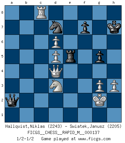 Last move : 1/2-1/2 2023 January 14 10:13:7 [Event "FICGS__CHESS__RAPID_M__000137"] [Site "FICGS"] [Date "2022.10.03"] [Round "1"] [White "Hallqvist,Niklas"] [Black "Swiatek,Janusz"] [Result "1/2-1/2"] [WhiteElo "2243"] [BlackElo "2205"] 1.c4 e5 2.g3 Nf6 3.Bg2 c6 4.d4 e4 5.Bg5 d5 6.Bxf6 Qxf6 7.Nc3 Bb4 8.e3 Bxc3+ 9.bxc3 Nd7 10.cxd5 cxd5 11.c4 Qc6 12.cxd5 Qc3+ 13.Kf1 Nf6 14.Ne2 Qa5 15.h3 O-O 16.Kg1 b6 17.Qb3 Ba6 18.Nc3 Bd3 19.Kh2 Rac8 20.Rhc1 h5 21.a4 Rfd8 22.Qb2 a6 23.Qd2 Re8 24.f3 exf3 25.Qxd3 fxg2 26.e4 Rc7 27.Rc2 Rec8 28.Rac1 Rc4 29.Kxg2 b5 30.d6 Qb6 31.e5 Nd7 32.axb5 axb5 33.Ne2 Qc6+ 34.d5 Qb7 35.Rxc4 bxc4 36.Qd4 Re8 37.Nf4 Rxe5 38.Rxc4 Re8 39.Nxh5 Re2+ 40.Kf3 Re5 41.Nf4 Qb1 42.Rc8+ Kh7 43.Kg2 g5 44.Nd3 Qa2+ 1/2-1/2 Follow this game move after move (download)I love all positions. Give me a difficult positional game, I will play it. But totally won positions, I cannot stand them. (Hein Donner) Wenn Dein Gegner dir ein Remis anbietet, versuch herauszufinden, weshalb er glaubt schlechter zu stehen. (Nigel Short) El Ajedrez es un regaderazo frío para la mente. (Sir John Simon) D'abord les bases : Jouez et étudiez, puis étudiez et jouez, ensuite jouez et étudiez, puis étudiez et jouez. Deuxièmement : Donnez toujours le meilleur de vous-même ! (Ken Smith) Optimism is a variety of information deficit. Sometimes especially true for correspondence chess games. (Michael Aigner)