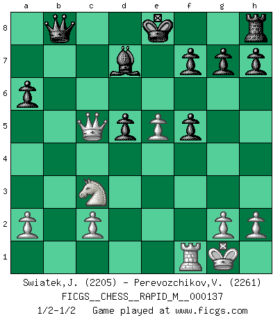 Last move : 1/2-1/2 2022 November 1 22:19:57 [Event "FICGS__CHESS__RAPID_M__000137"] [Site "FICGS"] [Date "2022.10.03"] [Round "1"] [White "Swiatek,Janusz"] [Black "Perevozchikov,Vjacheslav"] [Result "1/2-1/2"] [WhiteElo "2205"] [BlackElo "2261"] 1.e4 e6 2.d4 d5 3.Nc3 Nf6 4.e5 Nfd7 5.f4 c5 6.Nf3 Nc6 7.Be3 cxd4 8.Nxd4 Qb6 9.Qd2 Qxb2 10.Rb1 Qa3 11.Bb5 Nxd4 12.Bxd4 a6 13.Bxd7+ Bxd7 14.Rb3 Qe7 15.Rxb7 Rc8 16.f5 exf5 17.O-O Qd8 18.Bb6 Bc5+ 19.Bxc5 Rxc5 20.Qe3 Qc8 21.Rb8 Qxb8 22.Qxc5 1/2-1/2 Follow this game move after move (download)Some part of a mistake is always correct. (Savielly Tartakover) Schach sollte überall auf der Welt Schulfach werden. Es fördert die geistige Auseinandersetzung. Es lehrt die Demut in der Niederlage. (Garry Kasparov) Hay dos clases de hombres: aquellos que se conforman en dejarse llevar por las circunstancias y que juegan barajas y aquellos decididos a controlar las circunstancias y que juegan al Ajedrez. (Mortimer Collins) Un journaliste : 'Vous préférez avoir une dame de plus sur l'échiquier ou au lit ?' Boris Spassky : 'Ca dépend de la position.' My poor ole parrot... Is not in the circulation of displays ....poo hoo hoo :) (Wayne Lowrance's enigma)