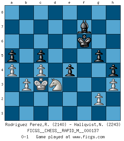 Last move : 0-1 2023 February 24 22:11:53 [Event "FICGS__CHESS__RAPID_M__000137"] [Site "FICGS"] [Date "2022.10.03"] [Round "1"] [White "Rodriguez Perez,Rene"] [Black "Hallqvist,Niklas"] [Result "0-1"] [WhiteElo "2140"] [BlackElo "2243"] 1.e4 e6 2.d4 d5 3.Bd3 dxe4 4.Bxe4 c5 5.Ne2 Nf6 6.Bf3 Be7 7.Be3 Qc7 8.Bf4 Qb6 9.O-O Nc6 10.Nd2 O-O 11.Nc4 Qa6 12.b3 Rd8 13.Bc7 Rd7 14.Bg3 cxd4 15.a4 Rd8 16.Bc7 Rd7 17.Bg3 Nd5 18.Nxd4 Nc3 19.Qe1 Nxd4 20.Qxc3 Nxf3+ 21.Qxf3 f6 22.Rad1 e5 23.Ne3 Qc6 24.Qxc6 bxc6 25.Rxd7 Bxd7 26.Rd1 Be6 27.f3 Rc8 28.Kf1 Rb8 29.Bf2 Kf7 30.Ke2 h5 31.h3 a6 32.Rd3 Bb4 33.Be1 Ke7 34.Nf1 h4 35.Bxb4+ Rxb4 36.Nd2 c5 37.c4 Rb7 38.Re3 a5 39.Ne4 Rc7 40.Rd3 Bg8 41.Rd1 f5 42.Nf2 Rb7 43.Rd3 Bf7 44.Re3 Kf6 45.Kd2 g5 46.Kc3 Re7 47.Nd3 e4 48.fxe4 Rxe4 49.Rxe4 fxe4 0-1 Follow this game move after move (download)Examine moves that smite! A good eye for smites is far more important than a knowledge of strategical principles. (Purdy) Karpov ist ein Museumsstück. (Garry Kasparov) Cada Peón es potencialmente una Reina. (James Mason) Karpov est une pièce de musée. (Garry Kasparov) I couldn't make any sense out of what this particular thread is about. It sounds like R2 D2 computer speaking. A space fight ?!? Some 'command' problems in Moscow ? Some killers & narcotic addicts attacking some game & a god wannabe ?? (Dinesh De Silva, lost in a russian conflict in FICGS forum)