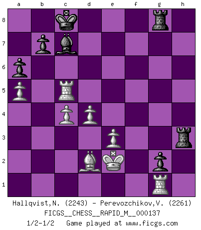 Last move : 1/2-1/2 2022 November 24 9:37:19 [Event "FICGS__CHESS__RAPID_M__000137"] [Site "FICGS"] [Date "2022.10.03"] [Round "1"] [White "Hallqvist,Niklas"] [Black "Perevozchikov,Vjacheslav"] [Result "1/2-1/2"] [WhiteElo "2243"] [BlackElo "2261"] 1.c4 Nf6 2.g3 c6 3.Nf3 d5 4.Bg2 dxc4 5.O-O Nbd7 6.Qc2 Nb6 7.Na3 Be6 8.Ne5 h5 9.Naxc4 Nxc4 10.Nxc4 h4 11.Ne5 hxg3 12.hxg3 Qd4 13.Qc3 Qxc3 14.bxc3 O-O-O 15.d3 Rh5 16.f4 g6 17.d4 Nd7 18.a4 Nxe5 19.fxe5 Bg7 20.a5 a6 21.g4 Rh4 22.g5 Rdh8 23.Kf2 Bh3 24.Bxh3+ Rxh3 25.e3 f5 26.exf6 exf6 27.gxf6 Bxf6 28.Ke2 Bd8 29.Bd2 g5 30.Rf5 g4 31.Rg1 g3 32.Kf3 Bc7 33.Rg5 Re8 34.c4 c5 35.Rxc5 g2 36.Ke2 Rg8 37.Kf2 Rf8+ 38.Ke2 Rg8 39.Kf2 Rf8+ 40.Ke2 Rg8 1/2-1/2 Follow this game move after move (download)You need not play well - just help your opponent to play badly. (Genrikh Chepukaitis) Offensichtlich kennt Kasparow nichts anderes als Schach, und ich könnte 500 weitere Spieler dieser Sorte benennen. (Judith Polgar) Fischer deseaba darle a los Rusos una sopa de su propia medicina. (Larry Evans) Ce qui caractérise les parties de combat, c'est que si le défenseur a constamment de difficiles problèmes à résoudre, l'attaquant doit chercher sans relâche de nouvelles possibilités d'attaque. (Koblentz) Lottery : A tax on people who are bad at math. (Author unknown)