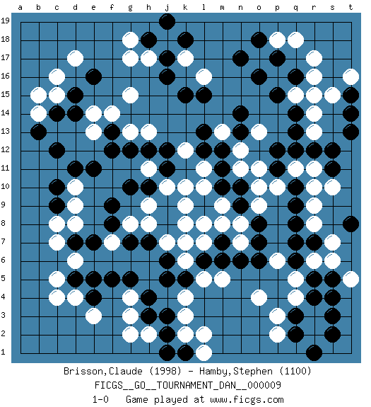 Last move : 1-0 2008 January 4 22:34:57 [Event "FICGS__GO__TOURNAMENT_DAN__000009"] [Site "FICGS"] [Date "2007.08.11"] [Round "1"] [Black "Brisson,Claude"] [White "Hamby,Stephen"] [Result "1-0"] [Rating 1 "1998"] [Rating 2 "1100"] 1.q16 c4 2.q3 d17 3.e4 g3 4.f5 c7 5.h4 e3 6.h3 d4 7.d15 c15 8.c14 c16 9.d14 g17 10.c10 r14 11.r12 o17 12.o16 r17 13.p17 r16 14.q14 r13 15.q13 q5 16.r7 r3 17.r4 q4 18.r5 r6 19.q6 s6 20.s3 r2 21.s5 p3 22.s2 t5 23.s4 s7 24.q2 p2 25.r1 r8 26.q7 o4 27.q8 r9 28.q9 r10 29.s11 s10 30.p11 r11 31.s12 q11 32.q12 p10 33.q10 o11 34.p12 o9 35.n6 p6 36.o8 n8 37.o7 m5 38.m6 l5 39.k7 k3 40.t8 n7 41.o6 l7 42.m7 m8 43.l6 l8 44.k5 k4 45.j5 k17 46.k15 l16 47.l15 d9 48.c9 d8 49.e11 f7 50.j9 k10 51.n10 o10 52.m11 n11 53.m10 l11 54.m12 k8 55.j8 l10 56.j12 j10 57.h10 h11 58.j11 h9 59.g10 j7 60.h7 k6 61.j6 k7 62.n9 h8 63.g7 g8 64.f8 k9 65.f9 m9 66.e7 n12 67.n13 m13 68.l12 o13 69.n14 k12 70.l13 q15 71.p15 r15 72.d5 c5 73.d7 c8 74.n17 h2 75.j2 g2 76.j3 k2 77.j17 j18 78.j16 g15 79.h18 h17 80.k18 g18 81.j19 g13 82.g12 h13 83.h12 q18 84.k1 l1 85.j1 l2 86.t15 s15 87.t14 t16 88.t13 p18 89.o18 b14 90.b13 b15 91.c12 g4 92.g5 d6 93.e5 d10 94.d11 e13 95.f13 f14 96.f12 e14 97.e16 1-0 Here are the names of the openings (joseki) played in the four corners : Corner d4 : c4 e4 Komoku (Somok, Xiao~mu`) 3-4 Point. The komoku (3-4) point is the traditional corner enclosure move.. Ikken Takagakari (Hankan Nop'dakeolch'im, Yi Gaogua`jiao~, 1-Space High Approach). The 5-4 approach move has become more popular in modern times, as modern Go emphasizes speed and influence. Corner d16 : d17 d15 Komoku (Somok, Xiao~mu`) 3-4 Point. The komoku (3-4) point is the traditional corner enclosure move.. Ikken Takagakari (Hankan Nop'dakeolch'im, Yi Gaogua`jiao~, 1-Space High Approach). The 5-4 approach move has become more popular in modern times, as modern Go emphasizes speed and influence. Corner q16 : q16 r14 Hoshi (Hwajeom, Seongjeom, Xingwei`) 4-4 Point. The star or hoshi (4-4) point, emphasizing influence at the potential expense of territory. Ikken Kakari (Hankan Keolch'im, Yi Gua`jiao~, 1-Space Low Approach). White 2 is the standard approach move to the 4-4. Corner q4 : q3 q5 Komoku (Somok, Xiao~mu`) 3-4 Point. The komoku (3-4) point is the traditional corner enclosure move.. Ikken Takagakari (Hankan Nop'dakeolch'im, Yi Gaogua`jiao~, 1-Space High Approach). The 5-4 approach move has become more popular in modern times, as modern Go emphasizes speed and influence. Player Black won this Go (weiqi, baduk) game. Follow this game move after move (download)In opponents' sphere of influence, avoid sharp conflict, don't move too deep. (Otake Hideo, 9p) If you have any trouble condescending, find a Unix user to show you how it's done. (Scott Adams)
