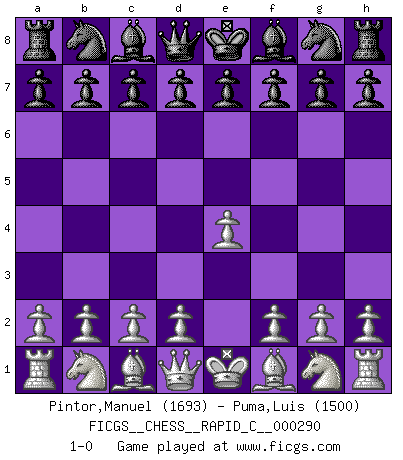 Last move : 1-0 2022 November 4 22:34:33 [Event "FICGS__CHESS__RAPID_C__000290"] [Site "FICGS"] [Date "2022.10.05"] [Round "1"] [White "Pintor,Manuel"] [Black "Puma,Luis"] [Result "1-0"] [WhiteElo "1693"] [BlackElo "1500"] 1.e4 1-0 This chess game has been lost on time (started : 2022.10.05 11:18:44) Follow this game move after move (download)Kasparov : J'adoube , Ivanchuk : S'il vous plaît ! (Garry Kasparov & Vassily Ivanchuk, Linares 1997) Ich würde die 30 stärksten Spieler der USA im Simultanspiel besiegen. (José Raúl Capablanca) Vive, pierde y aprende al observar a tu oponente como ganar. (Amber Steenbock) D'abord les bases : Jouez et étudiez, puis étudiez et jouez, ensuite jouez et étudiez, puis étudiez et jouez. Deuxièmement : Donnez toujours le meilleur de vous-même ! (Ken Smith) Treat your password like your toothbrush. Don't let anybody else use it, and get a new one every six months. (Clifford Stoll)
