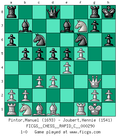 Last move : 1-0 2022 October 30 2:53:7 [Event "FICGS__CHESS__RAPID_C__000290"] [Site "FICGS"] [Date "2022.10.05"] [Round "1"] [White "Pintor,Manuel"] [Black "Joubert,Hennie"] [Result "1-0"] [WhiteElo "1693"] [BlackElo "1541"] 1.e4 c5 2.f4 Nc6 3.Nf3 e6 4.c3 d6 5.Bc4 Nf6 6.d3 Be7 7.O-O O-O 8.Ng5 h6 9.Nh3 a6 10.Qf3 b5 11.Bb3 Bb7 12.Qg3 Kh7 13.Bc2 e5 14.f5 Rg8 15.Bd1 d5 16.Ng5+ Kh8 17.Nxf7+ 1-0 Follow this game move after move (download)One bad move nullifies forty good ones. (Horowitz) Es genügt nicht ein guter Spieler zu sein, man muß auch gut spielen. (Siegbert Tarrasch) En la vida, como en el Ajedrez, los Peones propios obstruyen nuestro camino. La gran fortuna de un hombre, su comodidad, placer, hijos, libros, que deberían ayudarle a ganar, con mucha frecuencia lo ponen en Jaque Mate. (Charles Buxton) Les échecs, c'est la lutte contre l'erreur. (Johannes Zukertort) Horse racing is animated roulette. (Roger Kahn)