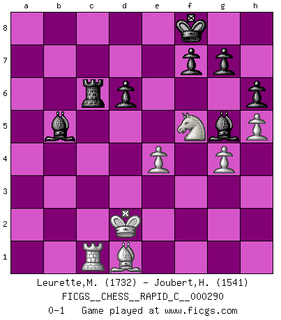 Last move : 0-1 2022 December 12 16:32:56 [Event "FICGS__CHESS__RAPID_C__000290"] [Site "FICGS"] [Date "2022.10.05"] [Round "1"] [White "Leurette,Marc-Antoine"] [Black "Joubert,Hennie"] [Result "0-1"] [WhiteElo "1732"] [BlackElo "1541"] 1.e4 c5 2.Nf3 e6 3.d4 cxd4 4.Nxd4 Nf6 5.Nc3 Qb6 6.Bd3 Qxd4 7.Be3 Qb4 8.Qc1 a6 9.a3 Qa5 10.O-O d6 11.b4 Qc7 12.Ne2 Be7 13.c4 b6 14.a4 Bb7 15.a5 bxa5 16.Rxa5 Nc6 17.Ra4 O-O 18.b5 axb5 19.Rxa8 Rxa8 20.cxb5 Rc8 21.bxc6 Bxc6 22.Ng3 Qb7 23.Qb1 Qxb1 24.Rxb1 Nd7 25.f3 Rb8 26.Rc1 Bb5 27.Bc2 h6 28.h3 Ne5 29.f4 Ng6 30.f5 exf5 31.Nxf5 Bf8 32.Bf4 Nxf4 33.Kf2 Rc8 34.Ke3 Ne6 35.Kd2 Nd4 36.Nxd4 Ba6 37.h4 Be7 38.g3 Bf6 39.Nf5 Rc6 40.h5 Kf8 41.g4 Bb5 42.Bd1 Bg5+ 0-1 Follow this game move after move (download)It is always better to sacrifice your opponent's men. (Savielly Tartakower) Die Elozahlen sind sehr schlecht für das Schach. Jetzt ist Schach eine Sportindustrie, die darauf zielt Elopunkte zu machen. (Miguel Najdorf) Yo tuve un dolor de muelas en la primer partida. En el segundo juego, tuve un dolor de cabeza. En el tercero, tuve un ataque de reumatísmo. En la cuarta partida, no me sentía muy bien. ¿Y en el quinto juego? Bueno, ¿que acaso uno tiene que ganar todos los juegos?. (Siegbert Tarrasch) On n'a jamais que l'âge auquel on a commence à jouer aux échecs car après on cesse de vieillir. (Capablanca) Knowledge rests not upon truth alone, but upon error also. (Carl G. Jung)