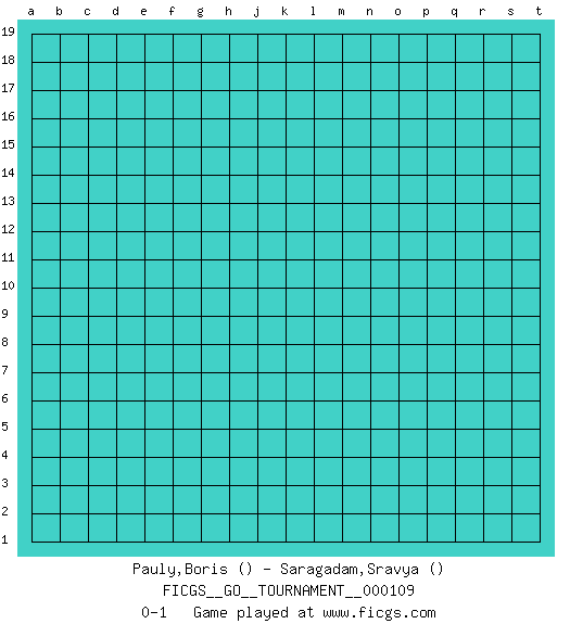 Last move : 0-1 2022 November 4 22:34:33 [Event "FICGS__GO__TOURNAMENT__000109"] [Site "FICGS"] [Date "2022.10.05"] [Round "1"] [Black "Pauly,Boris"] [White "Saragadam,Sravya"] [Result "0-1"] 0-1 This go game has been lost on time (started : 2022.10.05 12:26:52) Follow this game move after move (download)The poor player plays the opponent's game for him. (Anonymous) If you don't practice you don't deserve to win. (Andre Agassi)