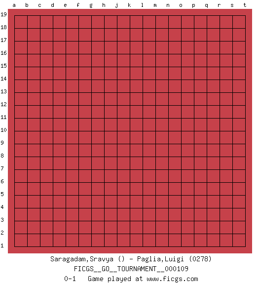 Last move : 0-1 2022 November 4 22:34:33 [Event "FICGS__GO__TOURNAMENT__000109"] [Site "FICGS"] [Date "2022.10.05"] [Round "1"] [Black "Saragadam,Sravya"] [White "Paglia,Luigi"] [Result "0-1"] [Rating 2 "0278"] 0-1 This go game has been lost on time (started : 2022.10.05 12:26:52) Follow this game move after move (download)Learning josekis by heart is useless if you don't try departing from them. (Pierre Audouard) Luck is when opportunity knocks and you answer. (Anonymous)