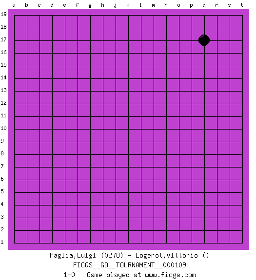 Last move : 1-0 2022 November 4 22:34:33 [Event "FICGS__GO__TOURNAMENT__000109"] [Site "FICGS"] [Date "2022.10.05"] [Round "1"] [Black "Paglia,Luigi"] [White "Logerot,Vittorio"] [Result "1-0"] [Rating 1 "0278"] 1.q17 1-0 This go game has been lost on time (started : 2022.10.05 12:26:52) Follow this game move after move (download)The intersection is rarely neutral. (Pierre Audouard) Hello Thibault, if I have had a plan (and I had one, I hope), I have forgotten it during the last week... - Hello Heinz-Georg. What do you mean a plan ? (Anonymous players, during a Big Chess game)