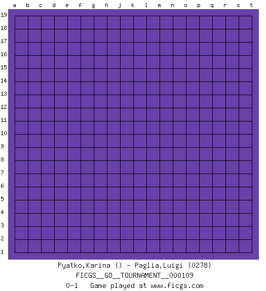 Last move : 0-1 2022 November 4 22:34:33 [Event "FICGS__GO__TOURNAMENT__000109"] [Site "FICGS"] [Date "2022.10.05"] [Round "1"] [Black "Pyatko,Karina"] [White "Paglia,Luigi"] [Result "0-1"] [Rating 2 "0278"] 0-1 This go game has been lost on time (started : 2022.10.05 12:26:52) Follow this game move after move (download)The second line is the line of defeat, the third line is the line of territory, and the fourth line is the line of influence. (Anonymous) It is not titles that honor men, but men that honor titles. (Niccolo Machiavelli)