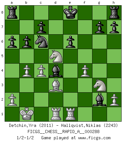 Last move : 1/2-1/2 2022 November 23 14:24:19 [Event "FICGS__CHESS__RAPID_A__000288"] [Site "FICGS"] [Date "2022.10.07"] [Round "1"] [White "Detchin,Yra"] [Black "Hallqvist,Niklas"] [Result "1/2-1/2"] [WhiteElo "2011"] [BlackElo "2243"] 1.d4 e6 2.c4 b6 3.e4 Bb4+ 4.Nc3 Bb7 5.f3 f5 6.exf5 Nh6 7.fxe6 Nf5 8.Bf4 dxe6 9.Qa4+ Nc6 10.O-O-O Nfxd4 11.Be3 Bc5 12.Bd3 a6 13.Bxd4 Bxd4 14.Nge2 Qg5+ 15.f4 Be3+ 16.Kb1 Qa5 17.Qxa5 Nxa5 18.b4 Bxg2 19.Rhe1 Nc6 20.Ng3 Bd4 21.Nd5 1/2-1/2 Follow this game move after move (download)Chess is everything: art, science and sport. (Anatoly Karpov) Ich war schon mal beim Dopingtest. Da musste ich Urin abgeben, während Dritte zusahen. (Elisabeth Pähtz) Los asuntos humanos son como una partida de Ajedrez: solo aquellos que no lo toman seriamente, pueden ser llamados buenos jugadores. (Hung Tzu Ch'eng) La menace est plus forte que l'exécution. (Aaron Nimzovitch) There is a computer disease that anybody who works with computers knows about. It's a very serious disease and it interferes completely with the work. The trouble with computers is that you 'play' with them ! (Richard P. Feynman)