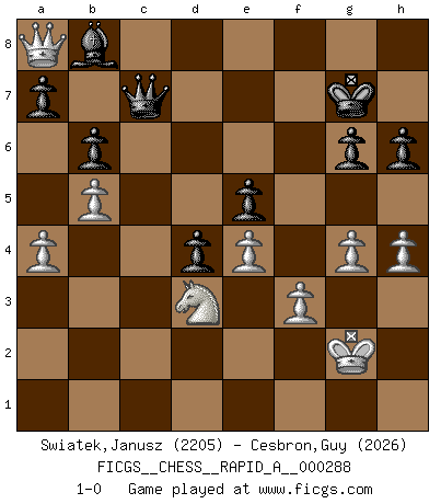 Last move : 1-0 2023 January 29 2:13:22 [Event "FICGS__CHESS__RAPID_A__000288"] [Site "FICGS"] [Date "2022.10.07"] [Round "1"] [White "Swiatek,Janusz"] [Black "Cesbron,Guy"] [Result "1-0"] [WhiteElo "2205"] [BlackElo "2026"] 1.d4 Nf6 2.c4 e6 3.Nf3 d5 4.g3 Bb4+ 5.Bd2 Be7 6.Bg2 O-O 7.Qc2 c6 8.O-O Nbd7 9.Bf4 b6 10.cxd5 cxd5 11.Rc1 Bb7 12.Bc7 Qe8 13.Qb3 Ne4 14.Nc3 Nxc3 15.Rxc3 Ba6 16.Bf1 Nf6 17.e3 Bxf1 18.Rxf1 Ne4 19.Rc2 Rc8 20.Rfc1 f6 21.Ne1 Qd7 22.f3 Nd6 23.Bxd6 Bxd6 24.Kf2 g6 25.Nd3 Kg7 26.Nf4 Rxc2+ 27.Qxc2 Rd8 28.Kg2 Kf7 29.h3 Kg7 30.h4 Bb8 31.a4 Bd6 32.Nd3 e5 33.dxe5 fxe5 34.Qc3 Qe7 35.Rd1 Rd7 36.Nf2 Bc5 37.Qb3 d4 38.e4 Rc7 39.Rc1 Bd6 40.Rxc7 Qxc7 41.g4 Qf7 42.Qb5 h6 43.Nd3 Qc7 44.Kg3 Qe7 45.Qd5 Bc7 46.Kg2 Qd6 47.Qa8 Bb8 48.b4 Qc7 49.b5 1-0 Follow this game move after move (download)It is not enough to be a good player... you must also play well. (Siegbert Tarrasch) Wenn Dein Gegner dir ein Remis anbietet, versuch herauszufinden, weshalb er glaubt schlechter zu stehen. (Nigel Short) Los errores estan ahí, esperando a que se cometan. (Savielly Tartakower) Il vaut toujours mieux jouer un plan faux de façon logique que de n'avoir pas de plan du tout. (Victor Kortchnoï) Don't anthropomorphize computers - they hate it. (Anonymous)