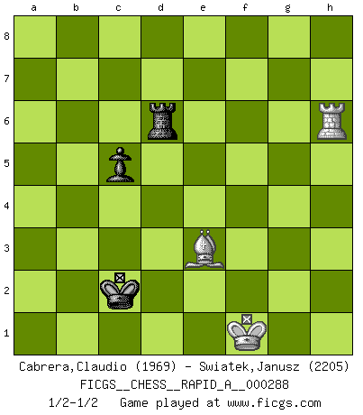 Last move : 1/2-1/2 2022 December 4 20:57:46 [Event "FICGS__CHESS__RAPID_A__000288"] [Site "FICGS"] [Date "2022.10.07"] [Round "1"] [White "Cabrera,Claudio"] [Black "Swiatek,Janusz"] [Result "1/2-1/2"] [WhiteElo "1969"] [BlackElo "2205"] 1.d4 d5 2.c4 e6 3.g3 dxc4 4.Bg2 e5 5.Nf3 exd4 6.Qxd4 Qxd4 7.Nxd4 Nf6 8.O-O Bc5 9.Nb5 Na6 10.N5a3 c6 11.Nxc4 Be6 12.Nbd2 O-O-O 13.a3 h5 14.h3 Nd5 15.Ne4 Be7 16.b4 Ndxb4 17.Ned6+ Bxd6 18.Nxd6+ Rxd6 19.axb4 Bd5 20.f3 Bc4 21.Bf4 Re6 22.h4 Bxe2 23.Rfc1 g6 24.Bh3 f5 25.Bf1 Rhe8 26.b5 Bxf1 27.Kxf1 Nb4 28.Bd2 Nd5 29.bxc6 Rxc6 30.Rxc6+ bxc6 31.Rxa7 Re7 32.Ra8+ Kc7 33.Bg5 Re6 34.g4 fxg4 35.fxg4 hxg4 36.Ra4 g3 37.Rg4 Kb6 38.Rxg3 Kb5 39.Bh6 c5 40.Bd2 Kc4 41.Rg5 Rd6 42.h5 gxh5 43.Rxh5 Kb3 44.Rh3+ Kc2 45.Rh6 Ne3+ 46.Bxe3 1/2-1/2 Follow this game move after move (download)When in doubt... play Chess ! (Tevis) Die westlichen Werte sind eine Sprache, welche die Putin-Administration nicht versteht. (Garry Kasparov) Sin errores no puede haber brillantez. (Emanuel Lasker) 'L'échange des dames est un coup dur pour les deux adversaires...' Un journaliste lors d'une partie du match Spassky-Fischer Children in the dark cause accidents, accidents in the dark cause children. (Unknown)