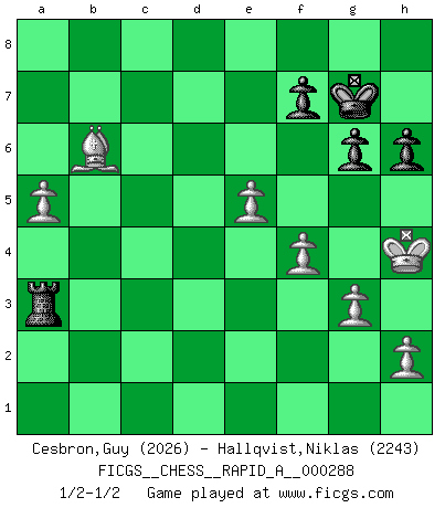 Last move : 1/2-1/2 2023 January 22 21:20:29 [Event "FICGS__CHESS__RAPID_A__000288"] [Site "FICGS"] [Date "2022.10.07"] [Round "1"] [White "Cesbron,Guy"] [Black "Hallqvist,Niklas"] [Result "1/2-1/2"] [WhiteElo "2026"] [BlackElo "2243"] 1.c4 c5 2.Nf3 Nc6 3.Nc3 Nf6 4.g3 d5 5.d4 e6 6.cxd5 Nxd5 7.Bg2 cxd4 8.Nxd4 Nxc3 9.bxc3 Nxd4 10.Qxd4 Qxd4 11.cxd4 Bd6 12.O-O Rb8 13.e4 O-O 14.e5 Be7 15.Be3 b5 16.a4 b4 17.d5 exd5 18.Bxa7 Rb7 19.Be3 b3 20.Rfb1 b2 21.Ra2 Ba3 22.Rxa3 Bf5 23.Rxb2 Rxb2 24.Bxd5 Bh3 25.Ra1 Rfb8 26.Be4 Rd8 27.f4 Rb4 28.Bg2 Bxg2 29.Kxg2 Rd3 30.Bg1 R4b3 31.a5 Ra3 32.Rxa3 Rxa3 33.Bb6 g6 34.Kh3 h6 35.Kg4 Kg7 36.Kh4 1/2-1/2 Follow this game move after move (download)Chess is thirty to forty percent psychology. You don't have this when you play a computer. I can't confuse it. (Judith Polgar) Spielt Blackmar-Diemer-Gambit, und das Matt kommt von selbst! (Emil Joseph Diemer) No solamente yo pronostico su triunfo sobre Botvinnik, sino que me adelanto y digo que probablemente Fischer es el jugador de Ajedrez mas grande que haya existido. (John Collins) Les échecs sont un jeu par leur forme, un art par leur essence et une science par sa difficulté d'acquisition. Ils peuvent vous procurer autant de plaisir qu'un bon livre ou une belle musique, mais vous n'aurez une réelle joie que si vous arrivez à bien jouer. (Tigran Petrosian) Every vice is only an exaggeration of a necessary and virtuous function. (Ralph Waldo Emerson, Journals 1936)