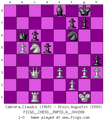 Last move : 1-0 2022 December 24 12:53:58 [Event "FICGS__CHESS__RAPID_A__000288"] [Site "FICGS"] [Date "2022.10.07"] [Round "1"] [White "Cabrera,Claudio"] [Black "Droin,Augustin"] [Result "1-0"] [WhiteElo "1969"] [BlackElo "2000"] 1.c4 Nf6 2.Nf3 e6 3.d4 Bb4+ 4.Bd2 a5 5.Qc2 d5 6.g3 O-O 7.Bg2 c5 8.cxd5 cxd4 9.Nxd4 Qb6 10.e3 exd5 11.O-O Nc6 12.Nxc6 bxc6 13.Rc1 Bd7 14.Nc3 Rfb8 15.Na4 Qd8 16.Bxb4 axb4 17.Nc5 Be8 18.a3 bxa3 19.Rxa3 Rxa3 20.bxa3 Qa5 21.a4 h5 22.h3 Rb4 23.Qc3 Qb6 24.Qa3 Qa5 25.Qc3 Qb6 26.Bf1 h4 27.Bb5 Rxb5 28.axb5 1-0 This chess game has been lost on time (started : 2022.10.07 1:43:55) Follow this game move after move (download)Only sissies Castle. (Rob Sillars) Schach ist ein Kampf gegen den Fehler. (Johannes Herrman Zukertort) La partida mas dura de ganar es una partida ganada. (Emanuel Lasker) Il n'y a plus de joueurs du niveau de Jacob Murray dont la seule quête est le beau jeu, le plaisir de voir les pièces construire quelque chose. Sur 10 idées à la minute, 9 seront sans intérêt, la dernière s'avèrera géniale. (Christian Bauer) Any activity becomes creative when the doer cares about doing it right or doing it better. (John Updike)