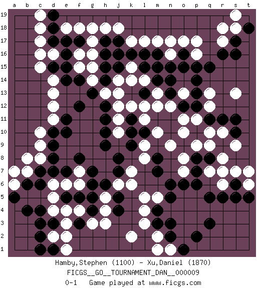 Last move : 0-1 2008 January 11 21:27:51 [Event "FICGS__GO__TOURNAMENT_DAN__000009"] [Site "FICGS"] [Date "2007.08.11"] [Round "1"] [Black "Hamby,Stephen"] [White "Xu,Daniel"] [Result "0-1"] [Rating 1 "1100"] [Rating 2 "1870"] 1.r16 d4 2.q3 d16 3.f17 d14 4.d18 c17 5.j17 p17 6.q15 m17 7.r11 r17 8.s17 r18 9.c6 c8 10.f3 f4 11.c3 e3 12.c4 g3 13.q5 r7 14.s6 l3 15.n3 l5 16.q8 d11 17.o16 o17 18.m16 l17 19.l16 o8 20.p7 q9 21.p10 p9 22.r9 q10 23.q11 r10 24.s10 s9 25.s11 r8 26.d8 c9 27.d7 d2 28.c2 g15 29.j15 m12 30.n13 n12 31.o12 m13 32.m14 o13 33.n14 o11 34.p12 o10 35.f14 f15 36.h14 g14 37.g13 h13 38.h12 j13 39.f12 j12 40.h11 j11 41.h10 k17 42.k16 j18 43.h17 j10 44.h9 m2 45.n2 b7 46.b6 c18 47.n6 n1 48.o1 m1 49.p2 k7 50.m7 l8 51.h6 e18 52.j4 h5 53.j5 j6 54.g5 h4 55.g4 h3 56.f5 e4 57.j7 k6 58.j8 e6 59.g7 f7 60.f8 r6 61.r5 s18 62.s16 f18 63.k9 l9 64.k10 l11 65.l10 m10 66.e14 d13 67.e15 f16 68.e16 g17 69.e17 h18 70.d15 c15 71.d17 c16 72.k11 k12 73.d19 c19 74.l13 l12 75.e10 a6 76.a5 a7 77.b4 s7 78.s5 o7 79.o6 q7 80.p6 p16 81.p15 n16 82.o15 l14 83.l15 k14 84.m4 l4 85.d10 c10 86.m3 k2 87.d3 e2 88.e5 d5 89.g6 d6 90.c7 b8 91.m8 n9 92.h15 g16 93.h16 g18 94.e11 d12 95.t18 s19 96.n15 n17 97.e7 f6 98.d9 t6 99.t5 t7 100.d1 e1 101.c1 m5 102.n5 k15 103.j16 j14 104.m15 p11 105.p8 q12 106.p13 q13 107.p14 s13 0-1 Here are the names of the openings (joseki) played in the four corners : Corner d16 : d16 f17 Hoshi (Hwajeom, Seongjeom, Xingwei`) 4-4 Point. The star or hoshi (4-4) point, emphasizing influence at the potential expense of territory. Ikken Kakari (Hankan Keolch'im, Yi Gua`jiao~, 1-Space Low Approach). Black 2 is the standard approach move to the 4-4. Corner q16 : r16 p17 Komoku (Somok, Xiao~mu`) 3-4 Point. The komoku (3-4) point is the traditional corner enclosure move.. Ikken Kakari (Hankan Keolch'im, Yi Gua`jiao~, 1-Space Low Pincer). The small knight move is the basic approach move to the 3-4 point stone. It has been continually used for over four centuries. There are limitless variations, with new moves constantly being discovered. White 2 opens the door to a treaure store of joseki. Corner d4 : d4 c6 Hoshi (Hwajeom, Seongjeom, Xingwei`) 4-4 Point. The star or hoshi (4-4) point, emphasizing influence at the potential expense of territory. Ikken Kakari (Hankan Keolch'im, Yi Gua`jiao~, 1-Space Low Approach). Black 2 is the standard approach move to the 4-4. Player White won this Go (weiqi, baduk) game. Follow this game move after move (download)Everything happens on a grid-engraved board with black and white pieces, but if that's all you see then you don't know Go. (Pierre Audouard) The only sure thing about luck is that it will change. (Wilson Mizner)