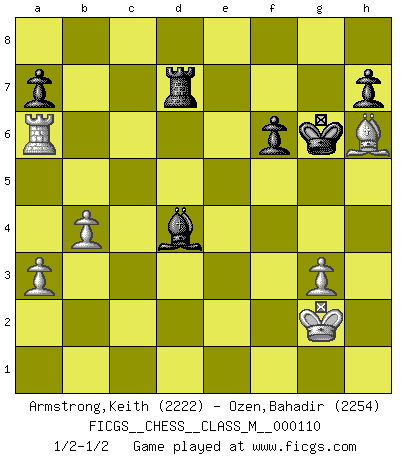 Last move : 1/2-1/2 2022 December 11 23:2:35 [Event "FICGS__CHESS__CLASS_M__000110"] [Site "FICGS"] [Date "2022.10.14"] [Round "1"] [White "Armstrong,Keith"] [Black "Ozen,Bahadir"] [Result "1/2-1/2"] [WhiteElo "2222"] [BlackElo "2254"] 1.Nf3 d5 2.g3 g6 3.d4 Nf6 4.Bg2 Bg7 5.c4 c6 6.O-O O-O 7.Qa4 Nfd7 8.Qc2 dxc4 9.Qxc4 e5 10.dxe5 Nxe5 11.Nxe5 Bxe5 12.Qc2 Na6 13.Nc3 Re8 14.Bh6 Bf5 15.e4 Be6 16.Rfd1 Qa5 17.a3 Rad8 18.Rxd8 Rxd8 19.Bf1 Rd7 20.Rc1 Bd4 21.Nd5 Bxd5 22.exd5 Qxd5 23.Bxa6 bxa6 24.Qxc6 Qxc6 25.Rxc6 f6 26.b4 g5 27.Kg2 Kf7 28.h4 gxh4 29.Rxa6 hxg3 30.fxg3 Kg6 1/2-1/2 Follow this game move after move (download)Fischer wanted to give the Russians a taste of their own medicine. (Larry Evans) Ich kenne Menschen, die allen Willen der Welt besitzen und doch nicht Schach spielen können. (Robert James Fischer) En manos de Fischer's, una diminuta ventaja teórica es tan buena como tener una Reina de ventaja. (Isaac Kashdan) L'attaque fait le spectacle, la défense gagne les matchs. (Dicton footballistique) It's unlucky to be superstitious. (Dave Enteles)