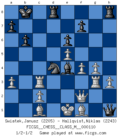 Last move : 1/2-1/2 2023 January 2 18:43:45 [Event "FICGS__CHESS__CLASS_M__000110"] [Site "FICGS"] [Date "2022.10.14"] [Round "1"] [White "Swiatek,Janusz"] [Black "Hallqvist,Niklas"] [Result "1/2-1/2"] [WhiteElo "2205"] [BlackElo "2243"] 1.e4 e6 2.d4 d5 3.Nc3 Bb4 4.e5 c5 5.a3 Bxc3+ 6.bxc3 Ne7 7.Qg4 cxd4 8.Qxg7 Rg8 9.Qxh7 Qc7 10.Ne2 dxc3 11.f4 Nbc6 12.Qd3 d4 13.Nxd4 Nxd4 14.Qxd4 Bd7 15.Rg1 Nf5 16.Qf2 Qc6 17.Bd3 Qd5 18.Rb1 Bc6 19.Rb3 O-O-O 20.Rxc3 Kb8 21.g4 Nd4 22.Rg3 Qh1+ 23.Bf1 b6 24.Bb2 Be4 25.h3 Rh8 26.Bc1 1/2-1/2 Follow this game move after move (download)Botvinnik tried to take the mystery out of Chess, always relating it to situations in ordinary life. He used to call Chess a typical inexact problem similar to those which people are always having to solve in everyday life. (Garry Kasparov) Du weisst es gibt ein Problem mit Computern und Fernschach, wenn jeder eine Rating von 2450 hat. (John Christen Knudsen) Bobby solo arroja las piezas y solas caen en las casillas correctas. (Miguel Najdorf ) Assurément je connaissais par expérience le mystérieux attrait de ce jeu royal, le seul entre tous les jeux inventés par les hommes qui échappe souverainement à la tyrannie du hasard, le seul où l'on ne doive sa victoire qu'à son intelligence ou plutôt à une certaine forme d'intelligence. Mais n'est-ce pas déjà le limiter injurieusement que d'appeler les échecs un jeu ? N'est-ce pas une science, un art ou quelque chose qui, comme le cercueil de Mahomet entre ciel et terre, est suspendu entre l'un et l'autre, et qui réunit un nombre incroyable de contraires ? [...] C'est une pensée qui ne mène à rien, une mathématique qui n'établit rien, un art qui ne laisse pas d'uvre, une architecture sans matière; et il l'a prouvé néanmoins qu'il était plus durable, à sa manière, que les livres ou que tout autre monument, ce jeu unique qui appartient à tous les peuples et à tous les temps, et dont personne ne sait quel dieu en fit don à la terre pour tuer l'ennui, pour aiguiser l'esprit et stimuler l'âme. Où commence-t-il, où finit-il ? (Stefan Zweig) In my experience, there's no such thing as luck. (Obi-Wan Kenobi in Star Wars ep.4)