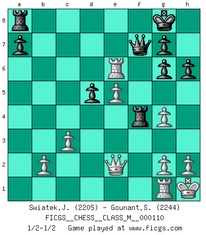 Last move : 1/2-1/2 2022 November 20 6:51:22 [Event "FICGS__CHESS__CLASS_M__000110"] [Site "FICGS"] [Date "2022.10.14"] [Round "1"] [White "Swiatek,Janusz"] [Black "Gounant,Stanislas"] [Result "1/2-1/2"] [WhiteElo "2205"] [BlackElo "2244"] 1.e4 c6 2.Nf3 d5 3.Nc3 Nf6 4.e5 Ne4 5.Ne2 Qb6 6.d4 e6 7.Ng3 c5 8.Bd3 Nxg3 9.fxg3 Nc6 10.O-O h6 11.dxc5 Bxc5+ 12.Kh1 Nb4 13.Be2 Nc6 14.a4 Bd7 15.c3 Be3 16.a5 Qc5 17.Bd2 Bxd2 18.Qxd2 Ne7 19.a6 bxa6 20.Rxa6 O-O 21.g4 Qc7 22.Bd3 Rfb8 23.Qe2 Ng6 24.Bxg6 fxg6 25.Nd4 Rf8 26.Rg1 Rf4 27.Nxe6 Bxe6 28.Rxe6 Qf7 1/2-1/2 Follow this game move after move (download)Bobby Fischer is the greatest Chess player who has ever lived. (Ken Smith) Ich habe Putins Aufstieg an die Macht beobachtet und seine Politik, die demokratischen Institutionen meines Landes zu zerstören. (Garry Kasparov) Los finales de Peón son del Ajedrez lo que el cesped es del Golf. (Cecil Purdy) Les Echecs ont trois composantes : le temps, l'espace et le matériel en dernier. (Mikhail Tal) Unless I accept my faults I will most certainly doubt my virtues. (Hugh Prather)
