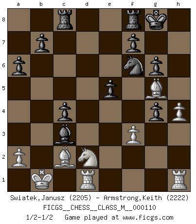 Last move : 1/2-1/2 2022 December 13 6:50:39 [Event "FICGS__CHESS__CLASS_M__000110"] [Site "FICGS"] [Date "2022.10.14"] [Round "1"] [White "Swiatek,Janusz"] [Black "Armstrong,Keith"] [Result "1/2-1/2"] [WhiteElo "2205"] [BlackElo "2222"] 1.e4 c5 2.Nf3 d6 3.d4 cxd4 4.Nxd4 Nf6 5.Nc3 a6 6.Be3 e5 7.Nb3 Be6 8.Qd2 Nbd7 9.f3 h5 10.Nd5 Bxd5 11.exd5 g6 12.O-O-O Nb6 13.Kb1 Nbxd5 14.Bg5 Be7 15.c4 Nb6 16.Na5 O-O 17.h4 Na4 18.Bd3 Rc8 19.g4 d5 20.Bc2 Nxb2 21.Kxb2 Qb6+ 22.Ka1 Bc5 23.Nb3 Bb4 24.Qe3 Qxe3 25.Bxe3 dxc4 26.Nd2 hxg4 27.Bg5 Bc3+ 28.Kb1 1/2-1/2 Follow this game move after move (download)You have to have the fighting spirit. You have to force moves and take chances. (Bobby Fischer) Ein Isolani verdüstert die Stimmung auf dem ganzen Schachbrett. (Savielly Grigorievitsch Tartakower) Cuando veas una buena jugada, trata de encontrar otra mejor. (Emanuel Lasker) Il vaut toujours mieux jouer un plan faux de façon logique que de n'avoir pas de plan du tout. (Victor Kortchnoï) Creativity is inventing, experimenting, growing, taking risks, breaking rules, making mistakes, and having fun. (Mary Lou Cook)
