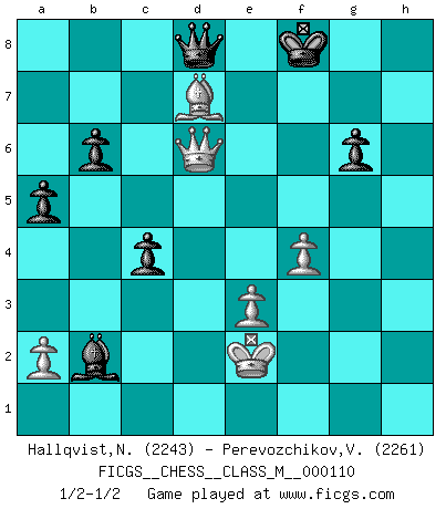 Last move : 1/2-1/2 2022 November 30 14:53:27 [Event "FICGS__CHESS__CLASS_M__000110"] [Site "FICGS"] [Date "2022.10.14"] [Round "1"] [White "Hallqvist,Niklas"] [Black "Perevozchikov,Vjacheslav"] [Result "1/2-1/2"] [WhiteElo "2243"] [BlackElo "2261"] 1.Nf3 Nf6 2.c4 g6 3.Nc3 d5 4.cxd5 Nxd5 5.h4 Bg7 6.h5 Nc6 7.d4 Bf5 8.Rh4 Bf6 9.g4 Bxh4 10.gxf5 e6 11.fxe6 fxe6 12.Bh3 Rf8 13.hxg6 Rxf3 14.exf3 hxg6 15.Qd3 Qf6 16.Qe4 Kf7 17.Nxd5 exd5 18.Qxd5+ Kg7 19.Be3 Rd8 20.Qe4 Nxd4 21.Kf1 b6 22.Rc1 c5 23.Bg4 a5 24.Qb7+ Kg8 25.Qe4 Bg5 26.f4 Bh4 27.Rd1 Kf7 28.Qh1 Nf5 29.Rxd8 Nxe3+ 30.fxe3 Qxd8 31.Ke2 c4 32.Qb7+ Kf8 33.Bd7 Bf6 34.Qd5 Bxb2 35.Qd6+ 1/2-1/2 Follow this game move after move (download)Chess is a more highly symbolic game, but the aggressions are therefore even more frankly represented in the play. It probably began as a war game; that is, the representation of a miniature battle between the forces of two kingdoms. (Karl Meninger) Vielleicht wirkt die Aura früherer Spieler glanzvoller als die der heutigen Spieler, aber das liegt daran, dass man kein Programm wie Fritz hatte, das einem all die Löcher in ihren Partien zeigt. (Vladimir Kramnik) Después de una mala apertura, hay una esperanza en el juego medio. Pero una vez que estas en finales, el momento de la verdad ha llegado. (Edmar Mednis) 'L'échange des dames est un coup dur pour les deux adversaires...' Un journaliste lors d'une partie du match Spassky-Fischer Just because you do not take an interest in politics doesn't mean politics won't take an interest in you. (Pericles 430 B.C.)
