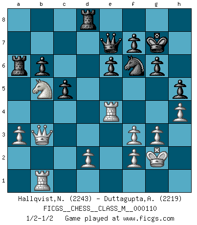 Last move : 1/2-1/2 2023 February 24 0:23:28 [Event "FICGS__CHESS__CLASS_M__000110"] [Site "FICGS"] [Date "2022.10.14"] [Round "1"] [White "Hallqvist,Niklas"] [Black "Duttagupta,Aniruddha"] [Result "1/2-1/2"] [WhiteElo "2243"] [BlackElo "2219"] 1.c4 c5 2.g3 Nc6 3.Bg2 g6 4.Nc3 Bg7 5.Nf3 Rb8 6.O-O d6 7.Rb1 Nf6 8.a3 O-O 9.b4 Nd7 10.Re1 b6 11.Bb2 Bb7 12.Nb5 Nf6 13.Ba1 a6 14.Nc3 Nd4 15.b5 Nxf3+ 16.Bxf3 Bxf3 17.exf3 Ra8 18.Kg2 h5 19.bxa6 Rxa6 20.Nb5 e6 21.h4 d5 22.cxd5 Nxd5 23.Bxg7 Kxg7 24.Re4 Nf6 25.Re3 Nd5 26.Re2 Qe7 27.Qb3 Rd8 28.Re4 Nf6 1/2-1/2 Follow this game move after move (download)Good positions don't win games, good moves do. (Gerald Abrahams) Ein guter Spieler hat immer Glück. (José Raúl Capablanca) Con el tiempo, empecé a progresar en partidas decisivas. Tal vez porque me di cuenta de una simple verdad: no solo estaba yo nervioso sino también mi oponente. (Mikhail Tal) Toute estimation doit être constamment réévaluée. (Jacob Estrin) If things go wrong, don't go with them. (Roger Babson)