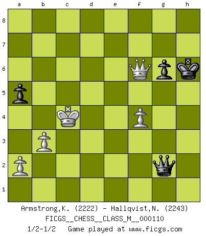 Last move : 1/2-1/2 2023 July 10 12:26:16 [Event "FICGS__CHESS__CLASS_M__000110"] [Site "FICGS"] [Date "2022.10.14"] [Round "1"] [White "Armstrong,Keith"] [Black "Hallqvist,Niklas"] [Result "1/2-1/2"] [WhiteElo "2222"] [BlackElo "2243"] 1.Nf3 c5 2.e4 d6 3.d4 cxd4 4.Nxd4 Nf6 5.Nc3 a6 6.Be3 e5 7.Nb3 Be6 8.f3 Nbd7 9.g4 Be7 10.Qd2 O-O 11.O-O-O b5 12.g5 Nh5 13.Kb1 Nb6 14.Na5 Rc8 15.Nd5 Nxd5 16.exd5 Bxd5 17.Qxd5 Qxa5 18.c4 Nf4 19.Bxf4 exf4 20.h4 Qa4 21.Rc1 Rfe8 22.Bd3 Rc5 23.Qe4 g6 24.h5 Re5 25.Qb7 bxc4 26.Bxc4 Rd8 27.hxg6 hxg6 28.Bxf7+ Kxf7 29.Rh7+ Ke8 30.Rh8+ Kf7 31.Rxd8 Rb5 32.Qa7 Qb4 33.b3 Rb7 34.Qa8 Bxd8 35.Qxd8 Re7 36.Rd1 Qc5 37.Qxd6 Qf5+ 38.Qd3 Qxg5 39.Qc4+ Re6 40.Rd6 Qe5 41.Rxe6 Qxe6 42.Qxf4+ Kg7 43.Qd4+ Kh7 44.f4 a5 45.Kb2 Qe2+ 46.Kc1 Qe1+ 47.Kc2 Qe2+ 48.Qd2 Qg4 49.Qf2 Qf5+ 50.Kc3 Qf6+ 51.Kd3 Qf5+ 52.Kc4 Qd7 53.Qh2+ Kg7 54.Qf2 Qc6+ 55.Qc5 Qg2 56.Qe5+ Kh7 57.Qe7+ Kg8 58.Qf6 Kh7 59.Qe7+ Kh8 60.Qf8+ Kh7 61.Qf7+ Kh6 62.Qf6 1/2-1/2 Follow this game move after move (download)There are two classes of men; those who are content to yield to circumstances and who play whist; those who aim to control circumstances, and who play Chess. (Mortimer Collins) Im Hotelzimmer gab es nur zwei Schaben. (Über die Turnierbedingungen) (Peter Swidler) Una de estas pequeñas movidas modestas pudieran ser mas molestas a tu oponente que la amenaza mas grande. (Siegbert Tarrasch) Les Echecs ne sont pas pour les âmes timides. Ils requièrent un homme entier, qui ne s'arrête pas aveuglément à ce qui a été déjà établi, mais qui tente individuellement de sonder les profondeurs du jeu. (W. Steinitz) If you ain't just a little scared when you enter a casino, you are either very rich or you haven't studied the games enough. (Pappy)