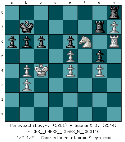 Last move : 1/2-1/2 2022 October 28 14:26:55 [Event "FICGS__CHESS__CLASS_M__000110"] [Site "FICGS"] [Date "2022.10.14"] [Round "1"] [White "Perevozchikov,Vjacheslav"] [Black "Gounant,Stanislas"] [Result "1/2-1/2"] [WhiteElo "2261"] [BlackElo "2244"] 1.Nf3 d5 2.c4 c6 3.e3 Nf6 4.d4 Bg4 5.Qb3 Qb6 6.Ne5 Bf5 7.cxd5 Qxb3 8.axb3 Nxd5 9.Bd3 Bxd3 10.Nxd3 e6 11.Bd2 Na6 12.Ke2 Be7 13.g4 Nab4 14.Nxb4 Bxb4 15.h4 Bxd2 16.Nxd2 a6 17.h5 O-O-O 18.Nf3 Nc7 19.h6 g6 20.Rac1 f5 21.Rc5 Rhe8 22.Re5 Kd7 23.Ng5 Re7 24.e4 Nb5 25.Ke3 Nd6 26.f3 fxg4 27.fxg4 Nf7 28.Nxh7 Nxe5 29.Nf6+ Kc7 30.dxe5 g5 31.h7 Rh8 32.Rh6 Rg7 33.Kd4 Kb6 34.Kc4 Kc7 35.b4 Kb6 36.b3 Kc7 37.Kc5 b6+ 38.Kc4 Kb7 1/2-1/2 Follow this game move after move (download)Fischer was a master of clarity and a king of artful positioning. His opponents would see where he was going but were powerless to stop him. (Bruce Pandolfini) Frage des Reporters: -Worin besteht das Ziel von Gambiteröffnungen? Antwort: -Auf Kosten der Partie einen Ruf als Angriffspieler zu erwerben.- (Siegbert Tarrasch) Prefiero perder una partida realmente buena, que ganar una mala. (David Levy) Vous savez, camarade Pachman, je n'éprouve pas de plaisir à être ministre, je jouerais plutôt aux échecs comme vous, ou alors ferais une révolution au Venezuela. (Che Guevara à Ludek Pachman, 'Checkmate in Prague', 1975) We're missing something. (Gregory House, House M.D.)