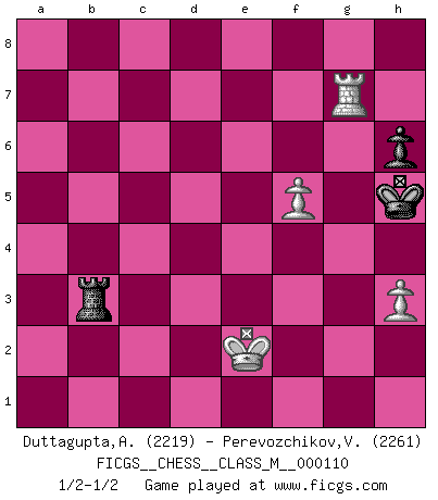 Last move : 1/2-1/2 2023 January 18 15:42:31 [Event "FICGS__CHESS__CLASS_M__000110"] [Site "FICGS"] [Date "2022.10.14"] [Round "1"] [White "Duttagupta,Aniruddha"] [Black "Perevozchikov,Vjacheslav"] [Result "1/2-1/2"] [WhiteElo "2219"] [BlackElo "2261"] 1.e4 e6 2.d4 d5 3.Nc3 Nf6 4.e5 Nfd7 5.f4 c5 6.Nf3 Nc6 7.Be3 cxd4 8.Nxd4 Qb6 9.Qd2 Qxb2 10.Rb1 Qa3 11.Bb5 Nxd4 12.Bxd4 a6 13.Bxd7+ Bxd7 14.Rb3 Qe7 15.Rxb7 Rc8 16.O-O Qd8 17.Qf2 Rxc3 18.Bxc3 Qc8 19.Rb3 Ba4 20.Bd4 Bxb3 21.axb3 Be7 22.c3 O-O 23.b4 f6 24.Re1 fxe5 25.Bxe5 Bf6 26.Bxf6 Rxf6 27.Qd4 h6 28.g3 Rf7 29.Qe5 Rc7 30.Qxe6+ Qxe6 31.Rxe6 Rxc3 32.Rxa6 Rb3 33.Rb6 d4 34.Kf1 Kf7 35.b5 Rb2 36.h3 d3 37.Ke1 Re2+ 38.Kd1 Re3 39.Rb7+ Kf6 40.b6 Rxg3 41.Rb8 Kg6 42.f5+ Kh5 43.Rg8 Rg1+ 44.Kd2 Rb1 45.Rxg7 Rxb6 46.Kxd3 Rb3+ 47.Ke2 1/2-1/2 Follow this game move after move (download)When you absolutely don't know what to do anymore, it is time to panic. (John van der Wiel) Schach ist das schnellste Spiel der Welt, weil man in jeder Sekunde Tausende von Gedanken ordnen muß. (Albert Einstein) El Ajedrez se juega con la mente... ¡no con las manos!. (Renaud y Kahn) Mais l'homme est une créature légère et illogique : semblable au joueur d'échecs, il n'aime que le processus du but à atteindre, non le but lui-même. (Dostoïevsky) There is a very easy way to return from a casino with a small fortune : go there with a large one. (Jack Yelton)