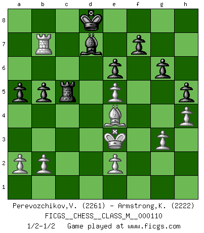 Last move : 1/2-1/2 2022 November 30 23:40:29 [Event "FICGS__CHESS__CLASS_M__000110"] [Site "FICGS"] [Date "2022.10.14"] [Round "1"] [White "Perevozchikov,Vjacheslav"] [Black "Armstrong,Keith"] [Result "1/2-1/2"] [WhiteElo "2261"] [BlackElo "2222"] 1.Nf3 Nf6 2.g3 c5 3.Bg2 Nc6 4.c4 d5 5.cxd5 Nxd5 6.d4 cxd4 7.Nxd4 Ndb4 8.Nxc6 Qxd1+ 9.Kxd1 Nxc6 10.Nc3 Bd7 11.Be3 g6 12.Rc1 Bg7 13.h4 h5 14.Ke1 Rc8 15.f4 b6 16.Kf2 Nd4 17.Bb7 Rc7 18.Bg2 Nf5 19.Nd5 Rxc1 20.Rxc1 Nxe3 21.Kxe3 e6 22.Nb4 a5 23.Nd3 Ke7 24.Rc7 Rc8 25.Rb7 b5 26.Be4 Kd8 27.Ne5 Bxe5 28.fxe5 Rc5 29.Rb8+ Ke7 30.Rb7 Kd8 31.Rb8+ Ke7 32.Rb7 Kd8 1/2-1/2 Follow this game move after move (download)By playing at Chess then, we may learn: First: Foresight... Second: Circumspection... Third: Caution... And lastly, we learn by Chess the habit of not being discouraged by present bad appearances in the state of our affairs, the habit of hoping for a favorable chance, and that of persevering in the secrets of resources. (Benjamin Franklin) Es ist besser die Steine des Gegners zu opfern. (Savielly Grigorievitsch Tartakower) El Ajedrez moderno está demasiado preocupado con cosas como la estructura de Peones. Olvidenlo, el Jaque Mate termina la partida. (Nigel Short) La victoire dans une partie d'Echecs appartient la plupart du temps à celui qui voit un peu plus loin que l'adversaire. (Lasker) Luck has a peculiar habit of favoring those who don't depend on it. (Author unknown)